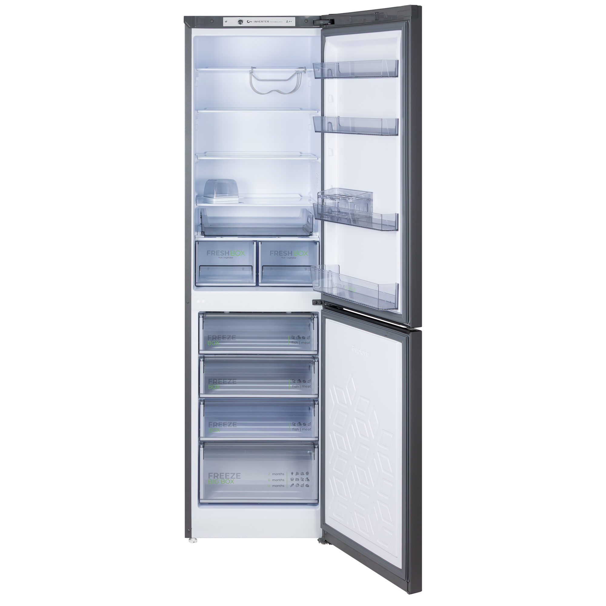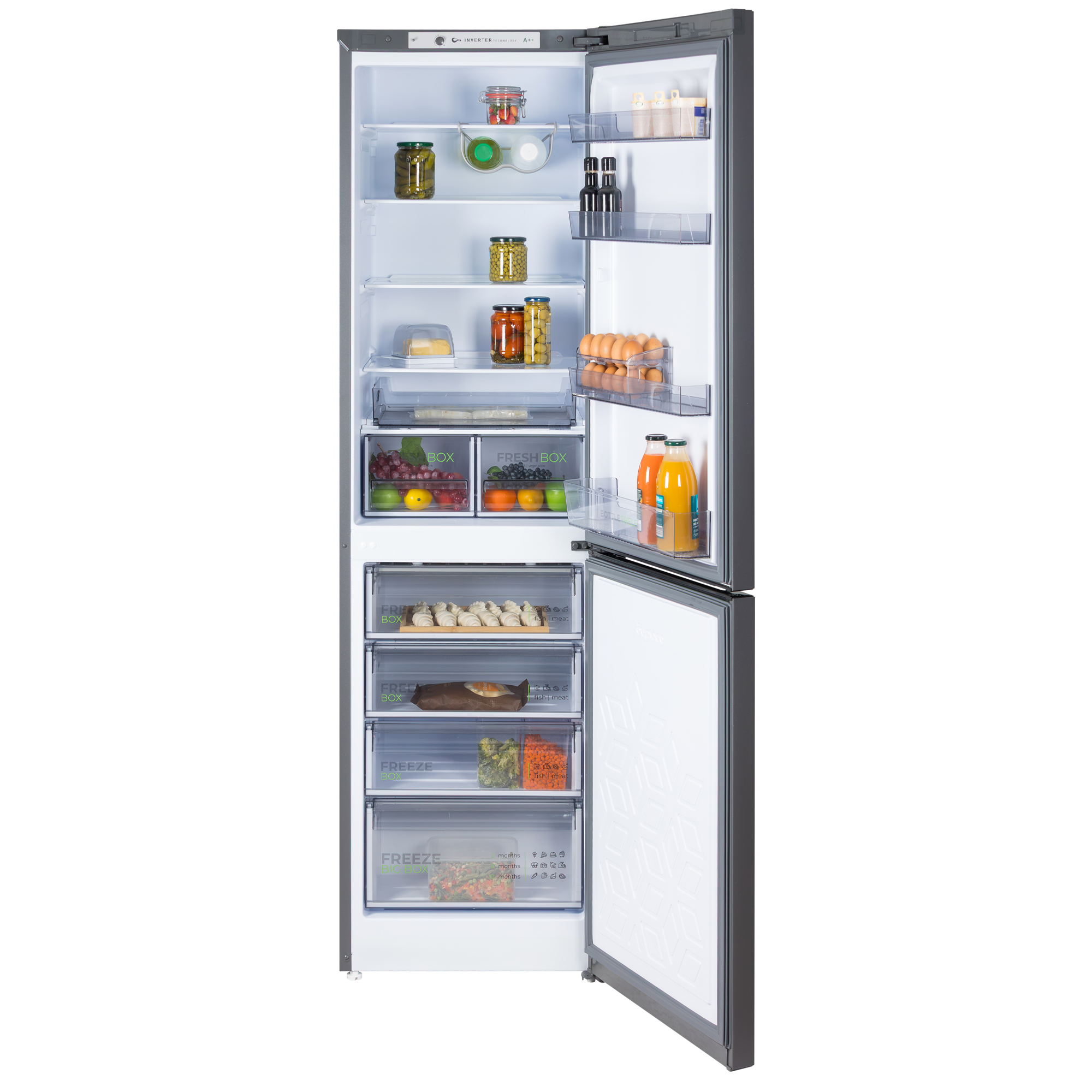Комплектация Контейнер для 20 яиц, масленка, выдвижной лоток, 2 складные полки, полка для бутылок
