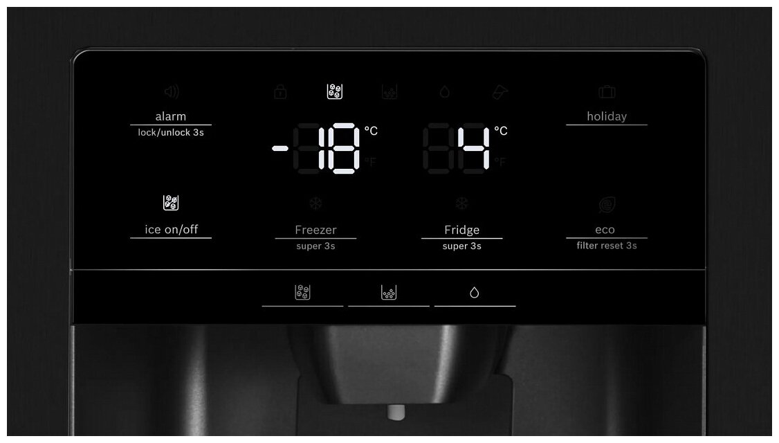 защита от детей, индикация температуры, льдогенератор, система подачи холодной воды