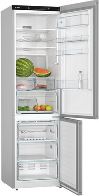 Дополнительно: Serie 4. Эко режим и режим Отпуск. Холодильники c PerfectFit могут быть установлены на кухне вплотную к мебели и стенам, без зазоров. Складная полка Garage Shelf. Холодильник c Bosch VarioInverter работает очень тихо и потребляет меньше электроэнергии, чем холодильник с обычным компрессором.