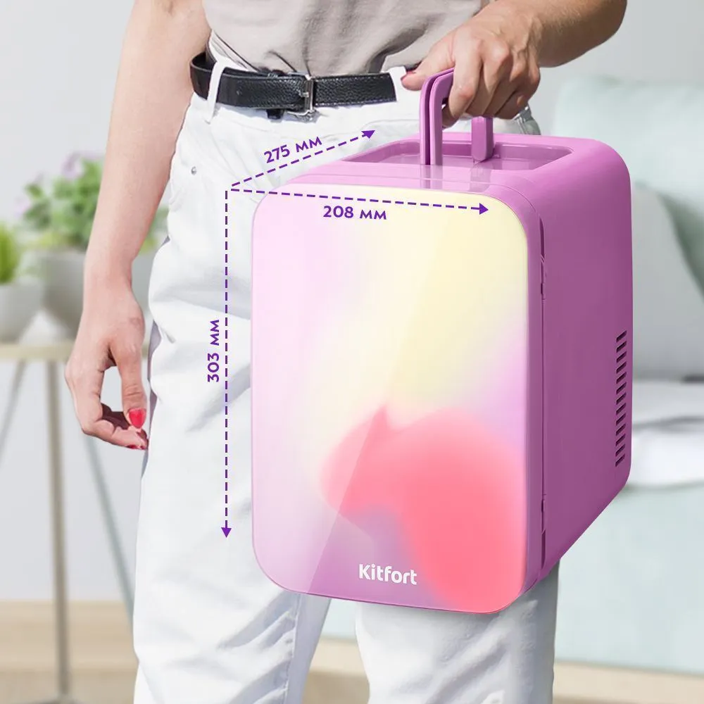 Холодильник для косметики КТ-4101 лёгкий и обладает компактными размерами, так что вы сможете поставить его на туалетный столик. Стильный дизайн прибора украсит интерьер, а продуманные детали, такие как удобная ручка, помогут комфортно перемещать прибор.
