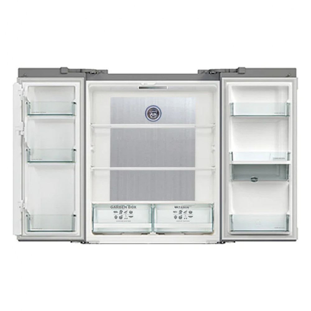 Внутренняя организация Вертикально регулируемые полки с высококачественным защитным стеклом : 2 Бокс для овощей /фруктов : 4 Выдвижные контейнеры МУЛЬТИБОКС : 8 Дверные отсеки : 3 Лотки для яиц : 1 Морозилка:Выдвижные ящики морозильной камеры : 2 Полки: 5 Коробка для супер-льда : 1