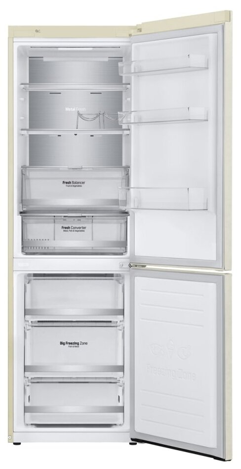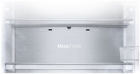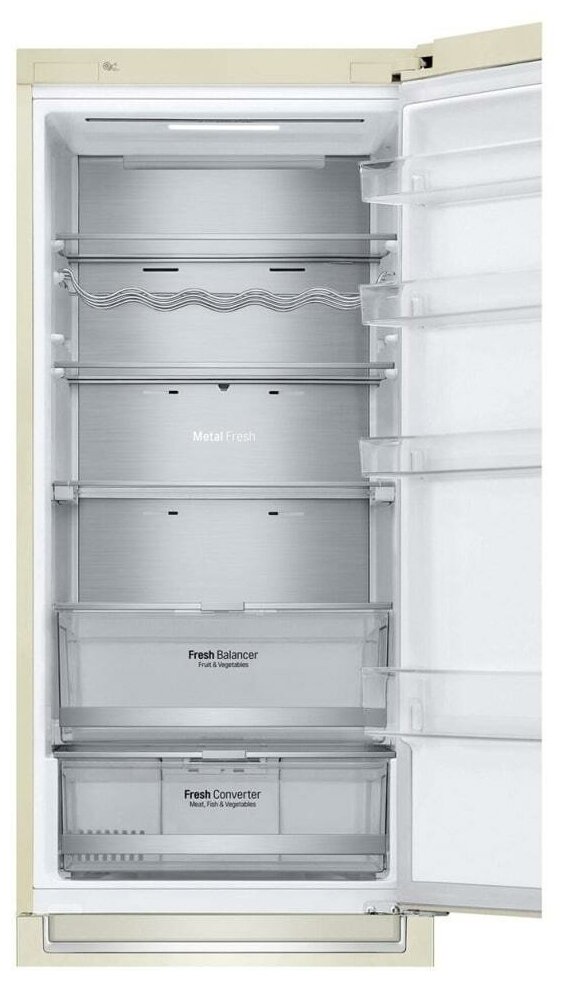 скрытая ручка, внешний кнопочный LED дисплей, антибактериальный дверной уплотнитель Bio Shield; морозильная камера: лоток для льда, металлическая окантовка ящиков; холодильная камера: лоток для яиц (1 × 10 яиц), направляющая для бутылок, зона свежести FRESHConverter, металлическая окантовка полок и ящиков, 3 дверные корзины