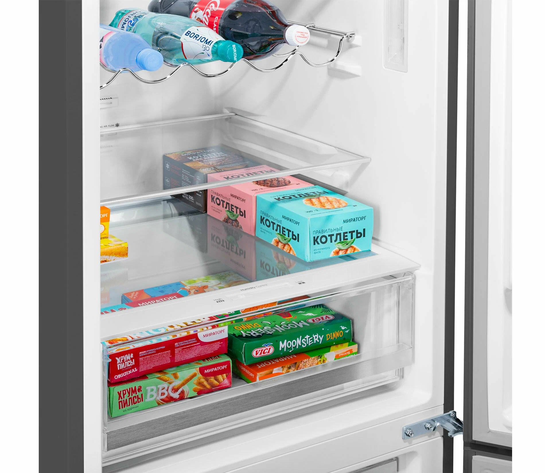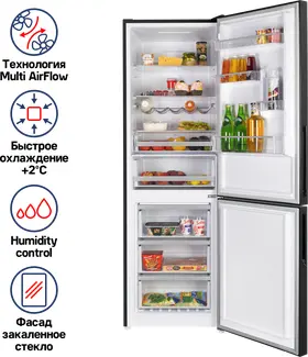 индикация температуры, система контроля влажности, Full No Frost, Антибактериальное покрытие камеры, Светодиодная подсветка, Скрытые ручки, Суперзаморозка