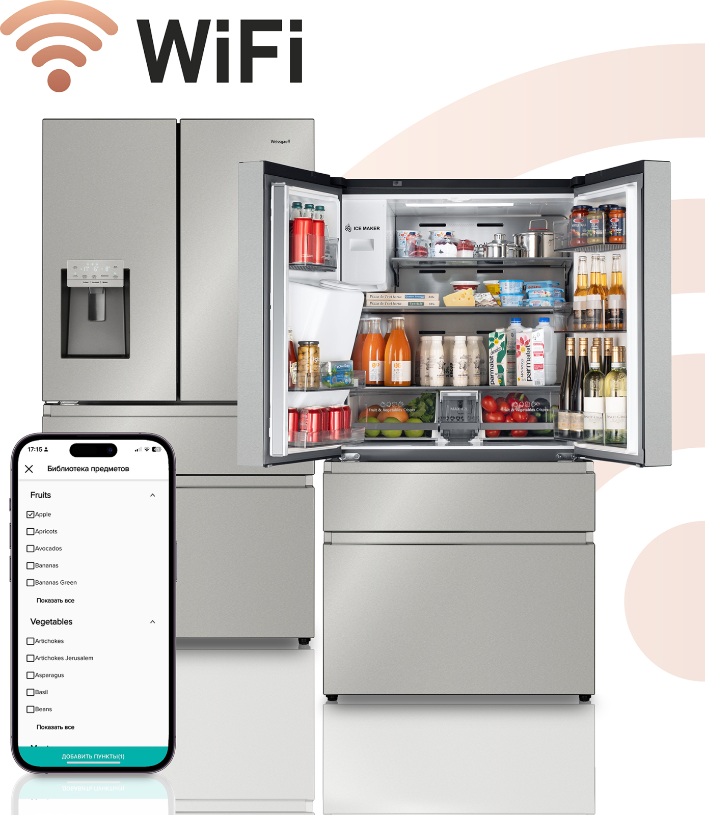 Отдельностоящий холодильник Weissgauff, выполненный в современном европейском дизайне FrenchDoor в цвете "нержавеющая сталь", обладающий Wi-Fi модулем управления с мобильным приложением, современным льдогенератором (с функциями подачи льда в кубиках, колотого льда и охлажденной воды), технологиями Multi Air Flow и Metal-Tech Cooling, а также полной системой размораживания Full No Frost - это поистине одна из самых передовых и функциональных моделей холодильников, имеющихся на рынке на сегодняшний день! Воплощая в себе соотношение фантастической вместительности, безупречной эргономики внутреннего пространства, технологического совершенства и великолепного дизайна - он является одним из безусловных флагманов Weissgauff, способным вывести для вас понимание того, на что способен холодильник, на совершенно новый уровень!
