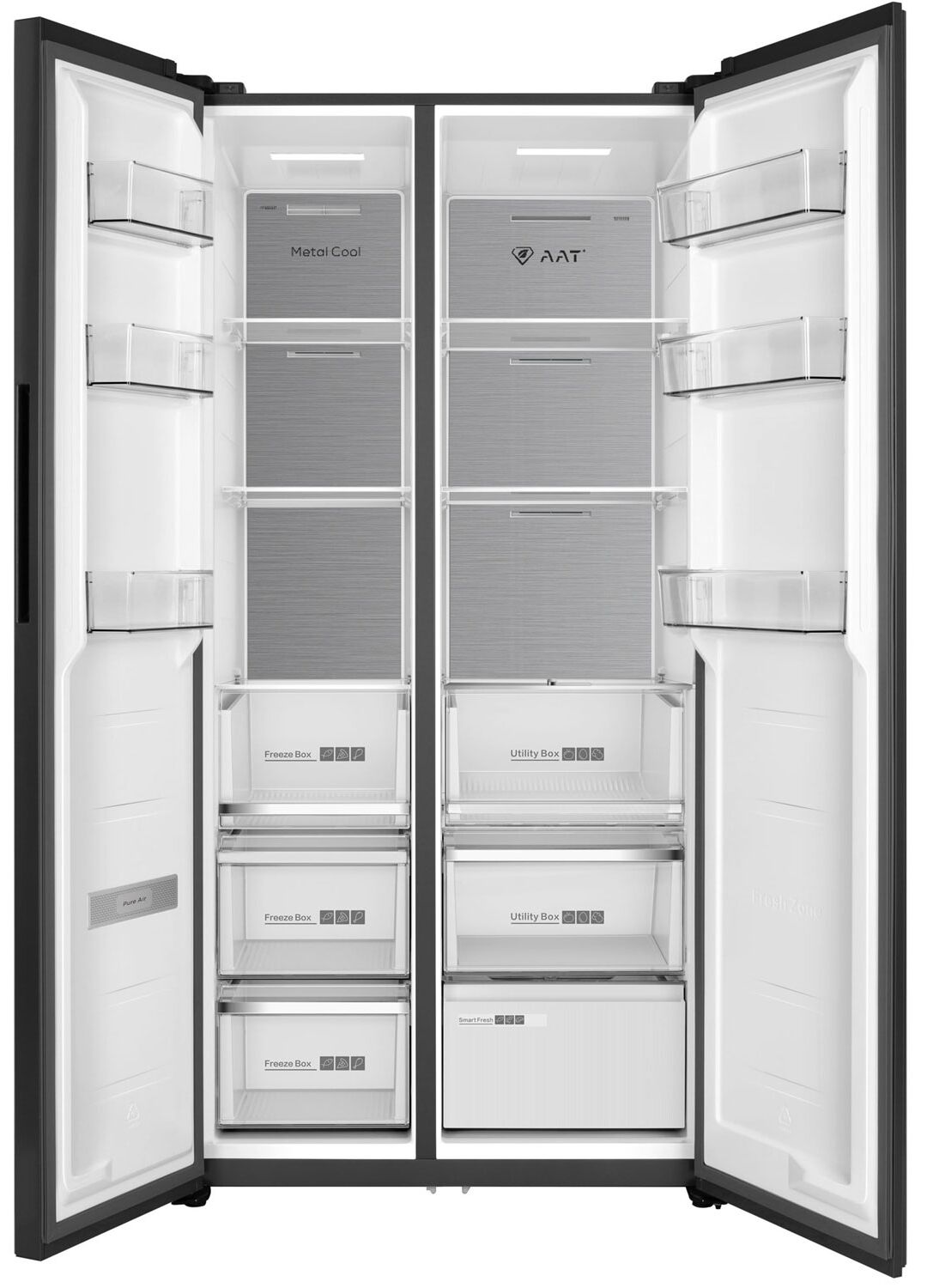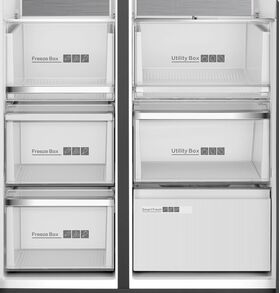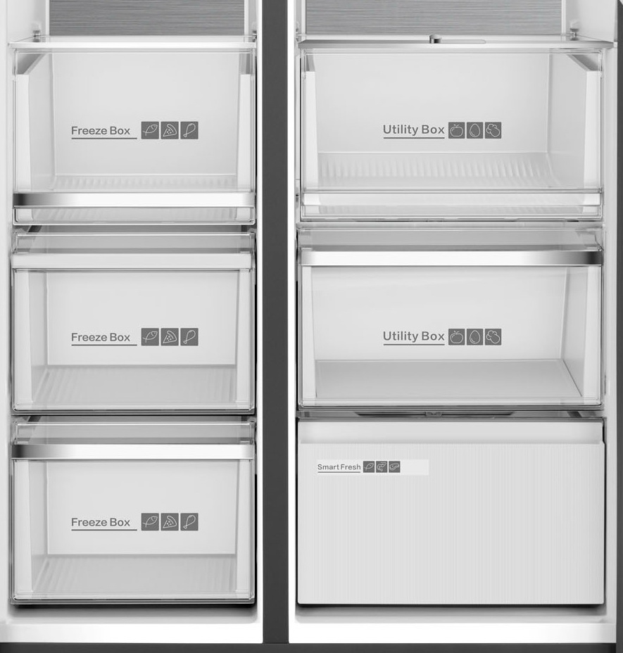 Полки и ящики со стальным обрамлением, Зона свежести Smart Fresh с регулировкой температуры от -3 до 4°С, Регулятор уровня влажности Humidity Control в выдвижном ящике, Предупреждение о повышении температуры в морозильной камере, Особая конструкция и теплоотвод позволяют встроить прибор в нишу