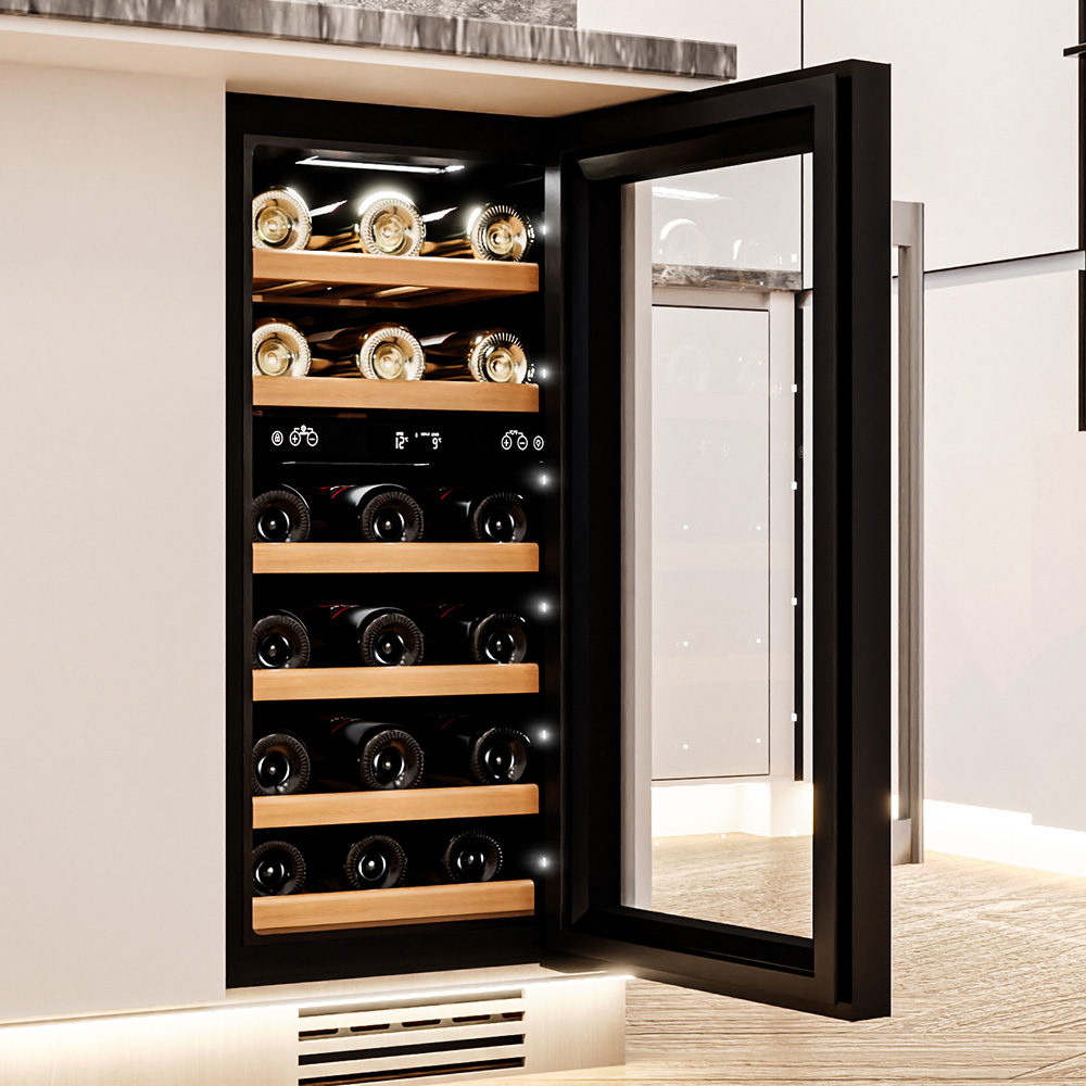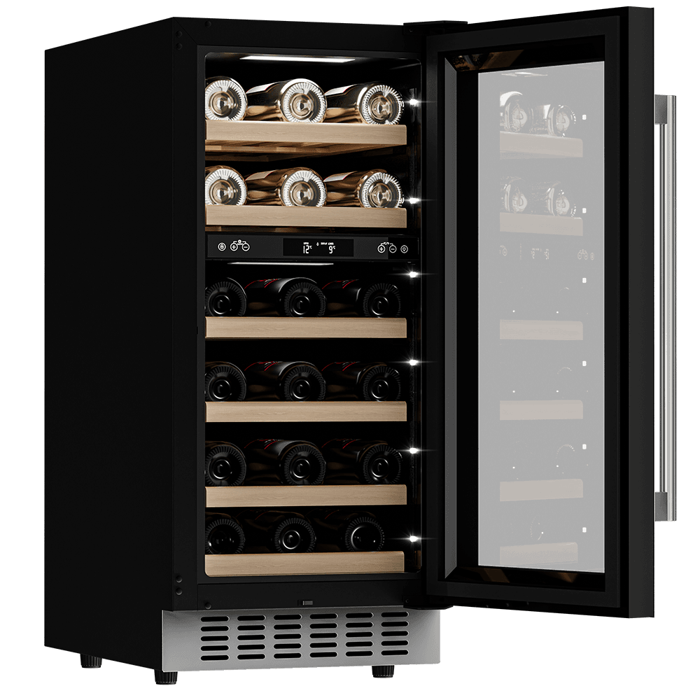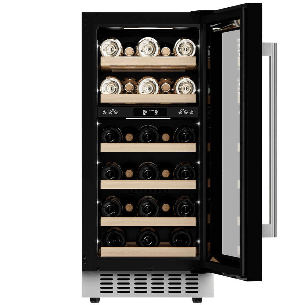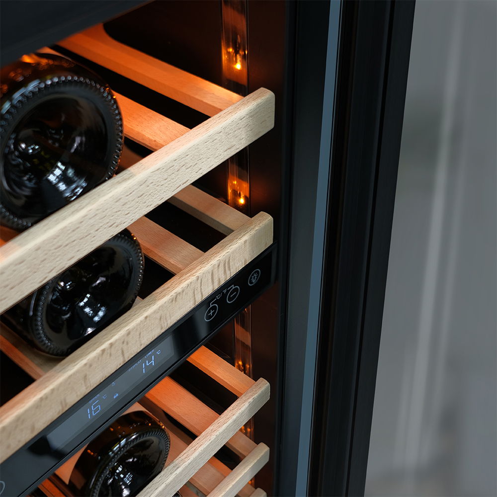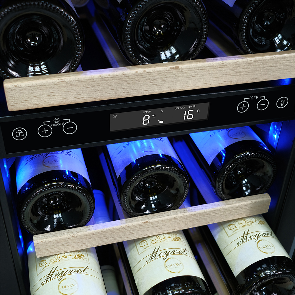 Компрессорный винный шкаф Meyvel MV28-KWT2 обладает большой вместимостью и даёт возможность разместить до 28 бутылок стандартного типа Бордо (0,75 л). Располагаются они на выдвижных полках из дерева. Внутреннее пространство шкафа разделено на 2 температурные зоны, с возможностью настраивать каждую из них. Общий диапазон температуры у данной модели от +5°C до +20°C.