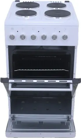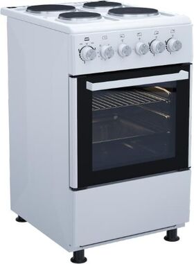 Плита отдельностоящая электрическая 50х60 см электрическая духовка, съемное внутреннее стекло (Cood Door), термостат, подсветка духовки, верхний, нижний тэн, 1 противень, 1 решетка, Рабочая поверхность (2 x ø145 мм - 1200 Вт + 2 x Ø185 мм - 1500 Вт), нижний ящик для посуды, объём духовки 52 л. без крышки. В комплекте: кабель, регулируемые ножки. Цвет Белый. Упаковка картон.