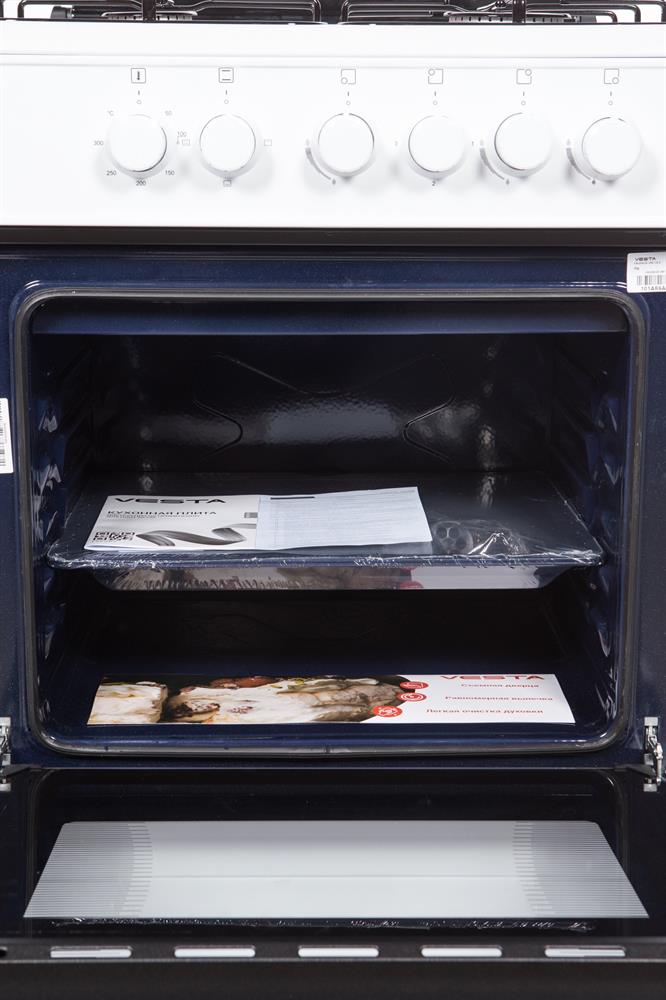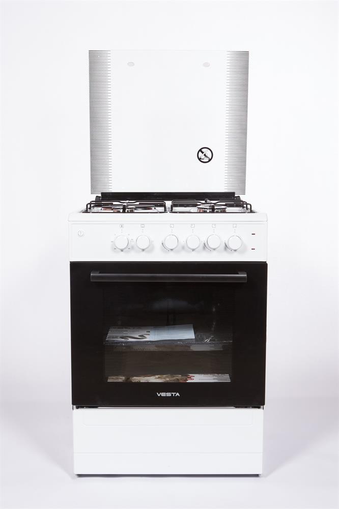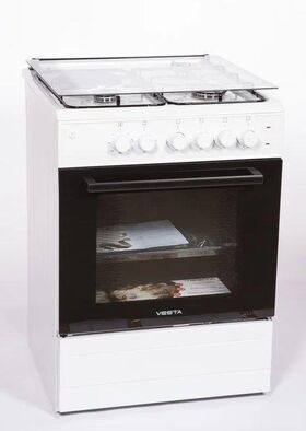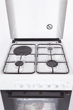 Горелки стола: Газовые – 3 шт. Электр.–1 шт. Мощность горелок рабочего стола: -Горелка передняя левая/правая – 2,0/2,4 кВт. Горелка задняя левая, электрическая – 1,5 кВт. Горелка задняя правая – 1,0 кВт. Решетка рабочего стола – сталь. Крышка рабочего стола – стекло. Верхний нагреватель духовки – ТЭН. Нижний нагреватель духовки – ТЭН. Электророзжиг при помощи кнопки. Электрическая подсветка духовки. Термостат, Индикатор работы электроконфорок. Индикатор работы ТЭНа духовки. Противень – 2 шт. Цвет Белый.
