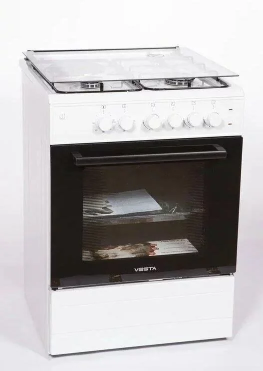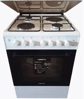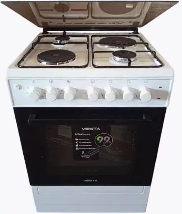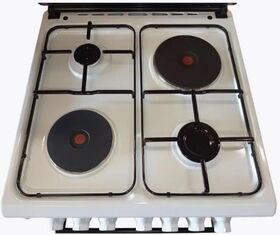 Комбинированная плита с двумя газовыми и двумя электрическими конфорками. Электроподжиг рабочей поверхности, подсветка духовки, конвекция (вентилятор ускоряет потоки воздуха, тем самым в разы увеличивая эффективность работы духовки). Чугунные решётки. В комплекте: никелированная решётка, 2 противня, форсунки для баллонного газа.
