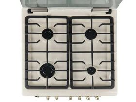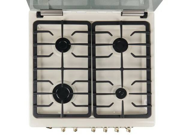Газовые конфорки. Решетки стола – чугун, съемные, раздельные. Крышка стола – стеклянная. Электроподжиг стола механический, кнопка. Балонный и магистральный газ.