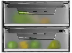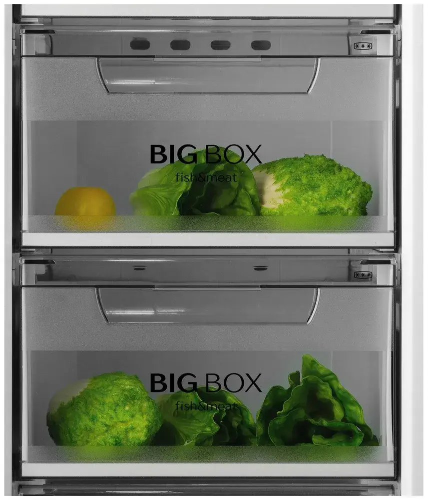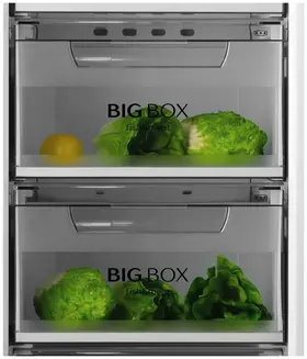 Устройство поддерживает размораживание No Frost, режим суперзаморозки и технологию FrostProtect. Корпус получил одно отделение с шестью ящиками. Дверь выполнена из металла и открывается вправо. Предусмотрено светодиодное освещение и вентилятор для равномерного распределения температуры. Уровень шума во время работы не превышает 37 дБ.