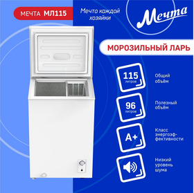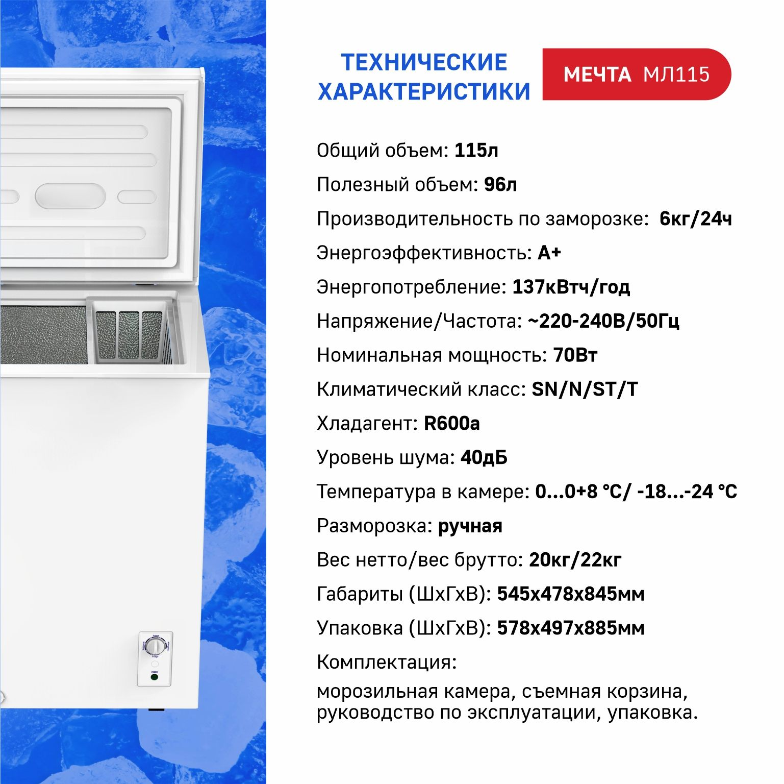 Морозильный ларь мечта МЛ-115 имеет общий объем 115 л, полезный объем 96 л; производительность при заморозке 6 кг/24 часа, энергоэффективность А+, энергопотребление 137 кВтч/год, номинальная мощность 70 Вт, климатический класс SN/ N/ ST/ T; хладогент R600а, уровень шума 40 дБ, температура в камере 0…0+8/ -18…-24 градусов.
