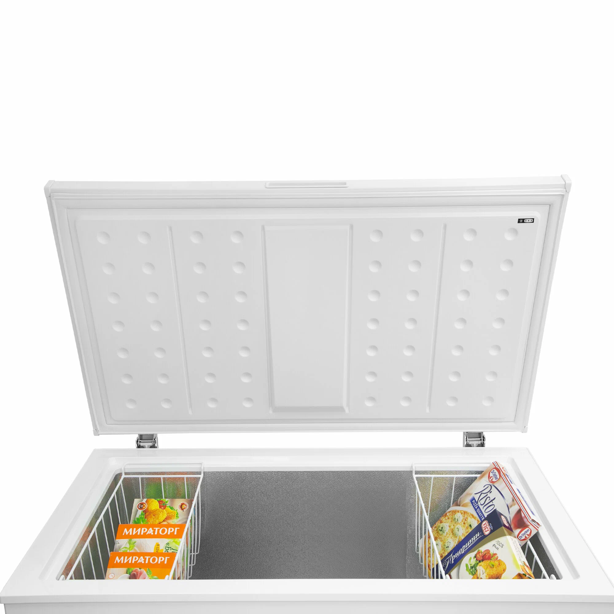 В комплект поставки входят две встроенные корзины для удобного размещения продуктов, скребок для льда, колеса для легкого перемещения.
