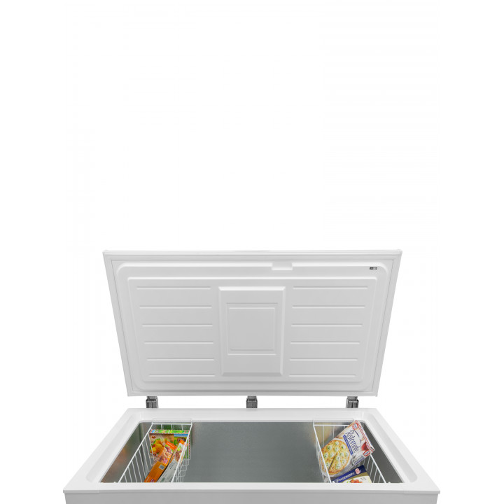 Ларь поставляется в комплектации с двумя встроенными корзинами для удобной организации продуктов, скребком для льда и колесами для перемещения.