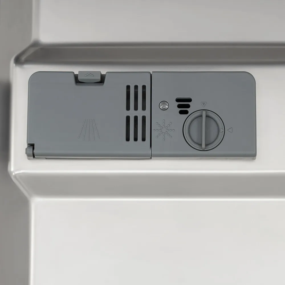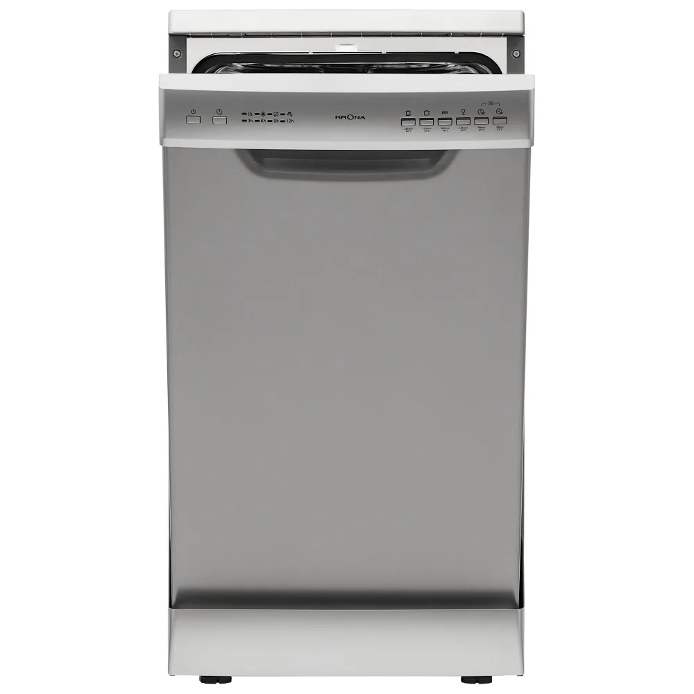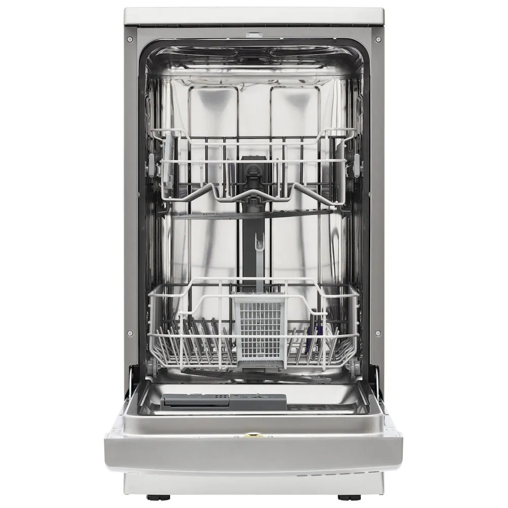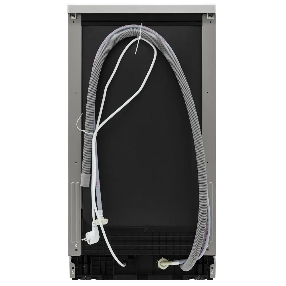 Отдельностоящая посудомоечная машина шириной 45 см вмещает 9 комплектов посуды. Для удобства использования в модели предусмотрен режим половинной загрузки, который позволяет экономить расход воды, таймер отложенного старта, а также возможность регулировки верхней корзины по высоте, что позволяет удобно загружать и мыть посуду разных размеров.