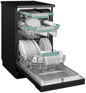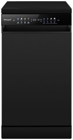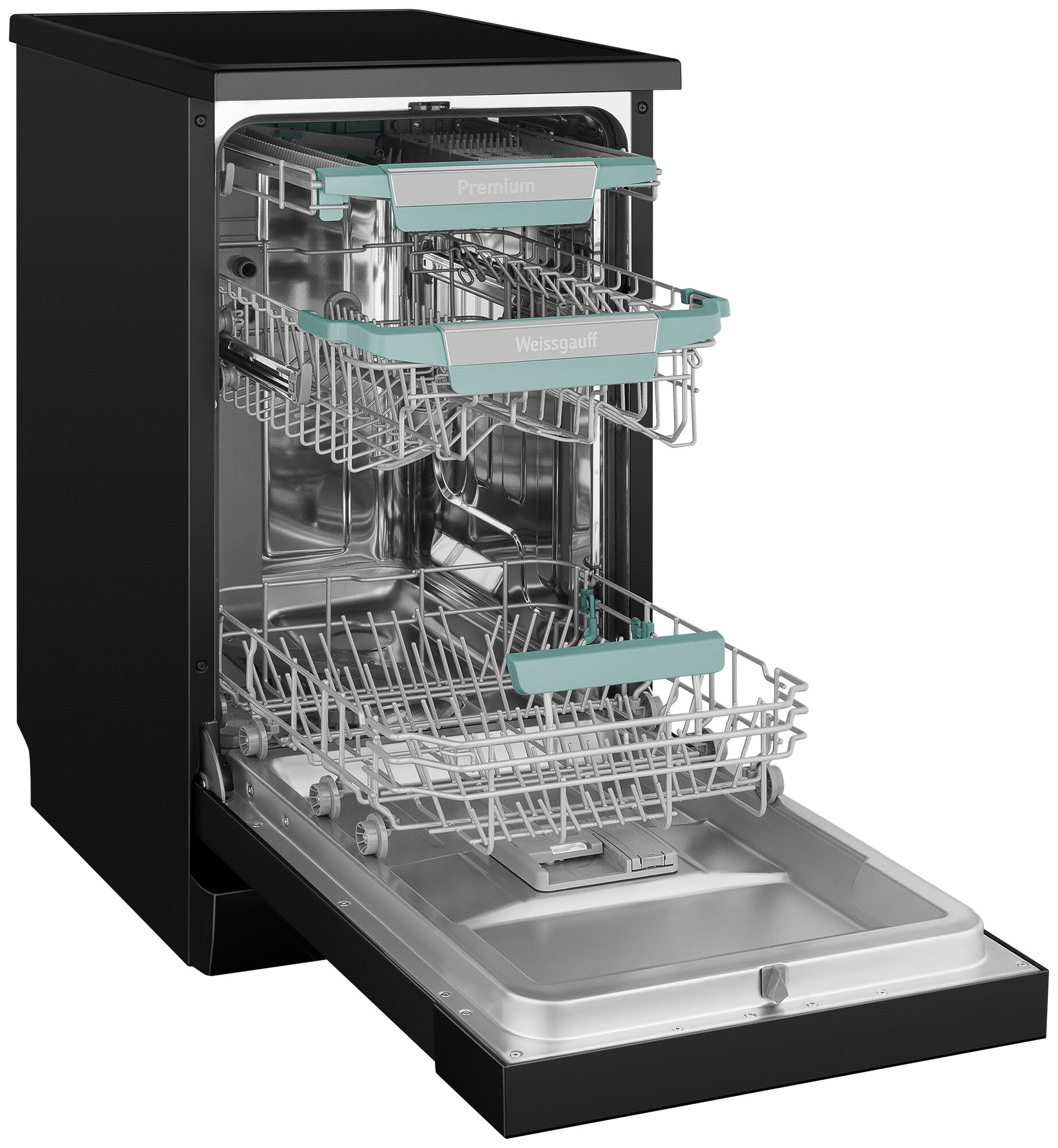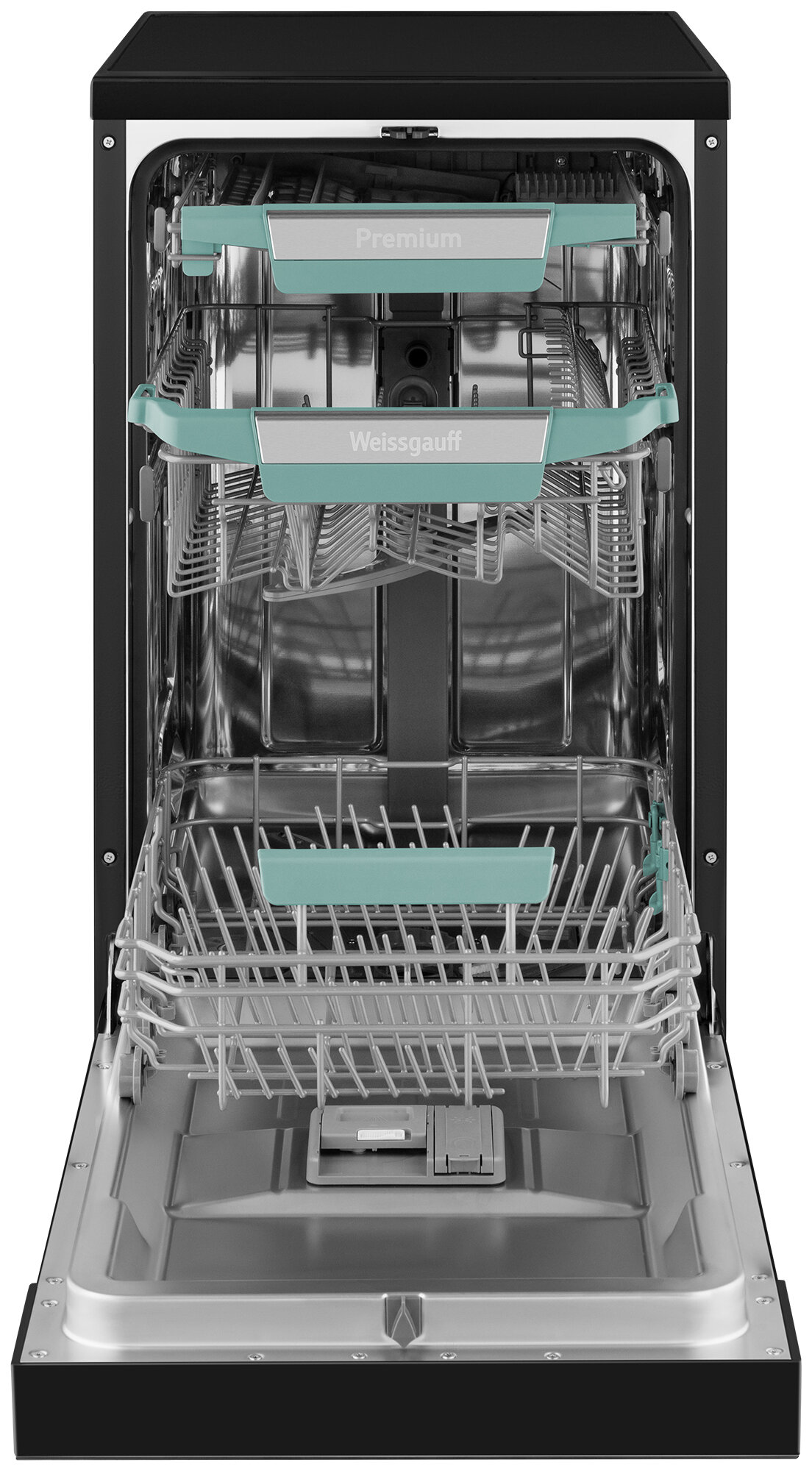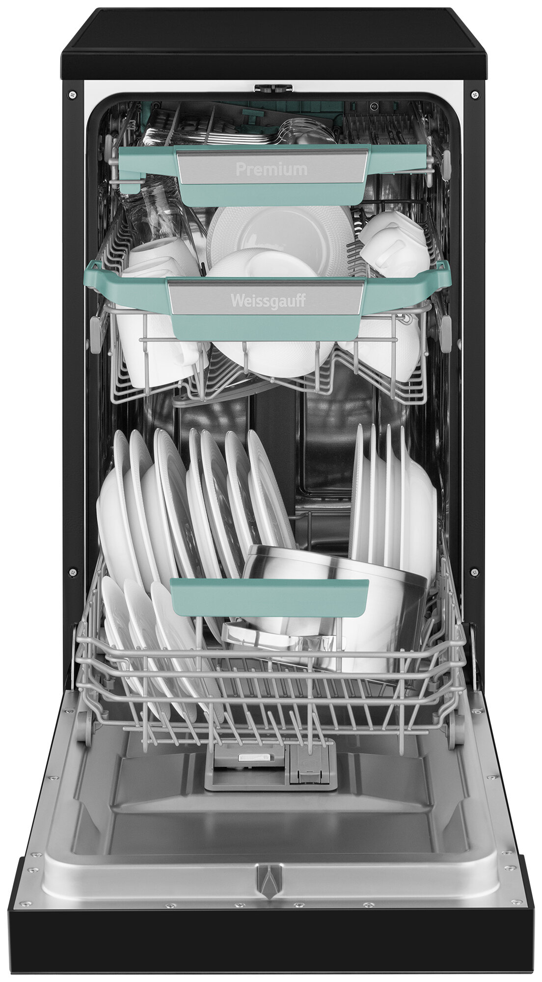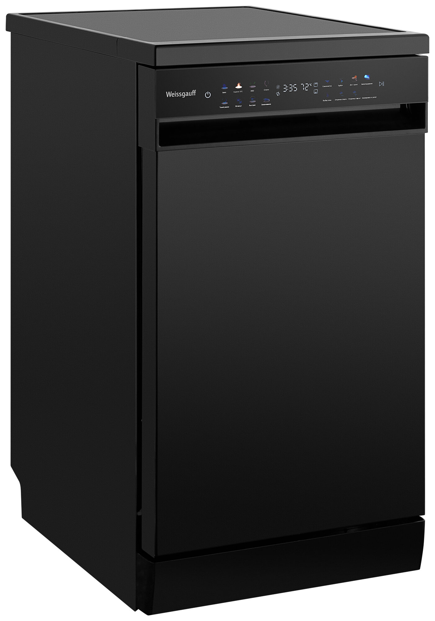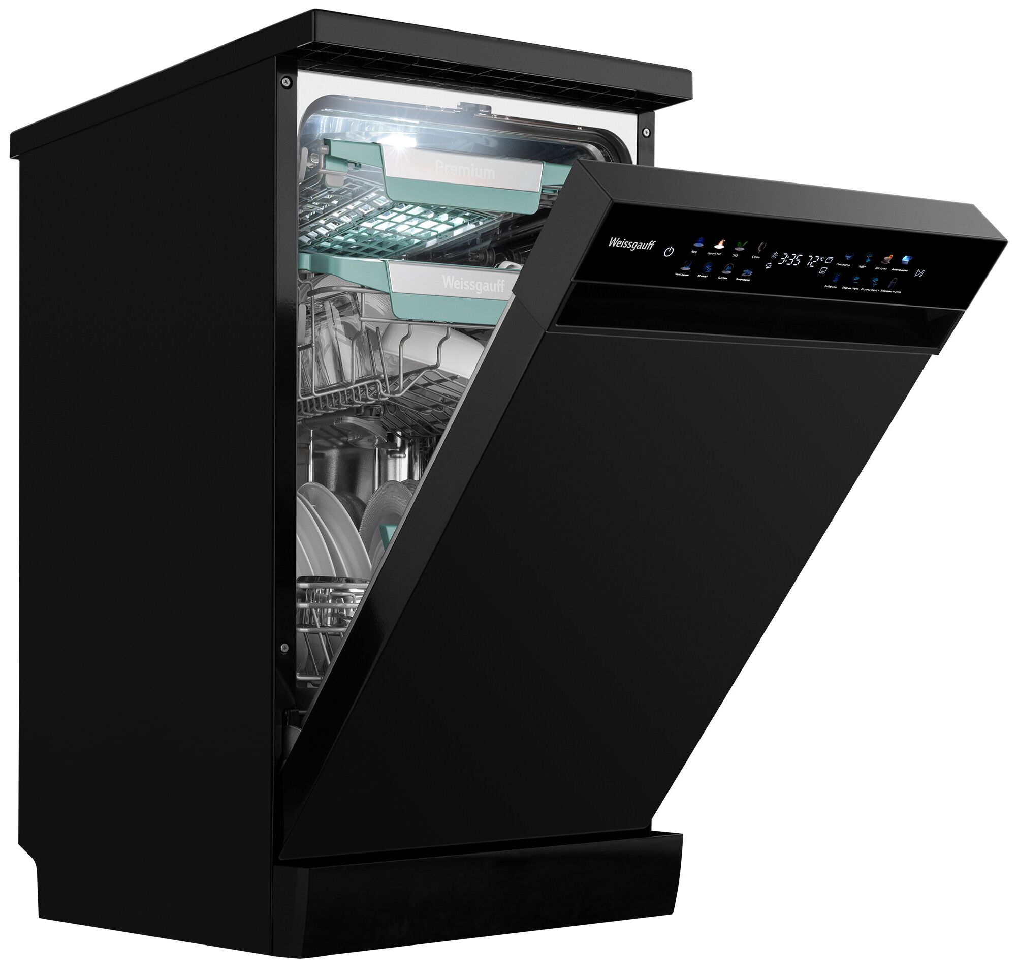 Узкая отдельностоящая посудомоечная машина Weissgauff c корпусом, выполненным в черном цвете с инновационным цветным дисплем SMART SCREEN с сенсорным управлением, инверторным двигателем и функцией автоматического открытия дверцы, не только сэкономит место на вашей кухне, но и обеспечит идеальный результат: 3 корзины позволят расположить посуду оптимальным образом для достижения наилучшего качества мытья, а вместимость посуды до 10 комплектов - это не только экономия места на кухне, но и отличное качество мытья вашей посуды.