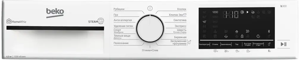 Программы стирки: Быстрая стирка, Замачивание, Стирка изделий из синтетики, Стирка изделий из хлопка, Стирка изделий из джинсовой ткани, Стирка пуховых вещей, Стирка спортивной одежды, Удаление пятен