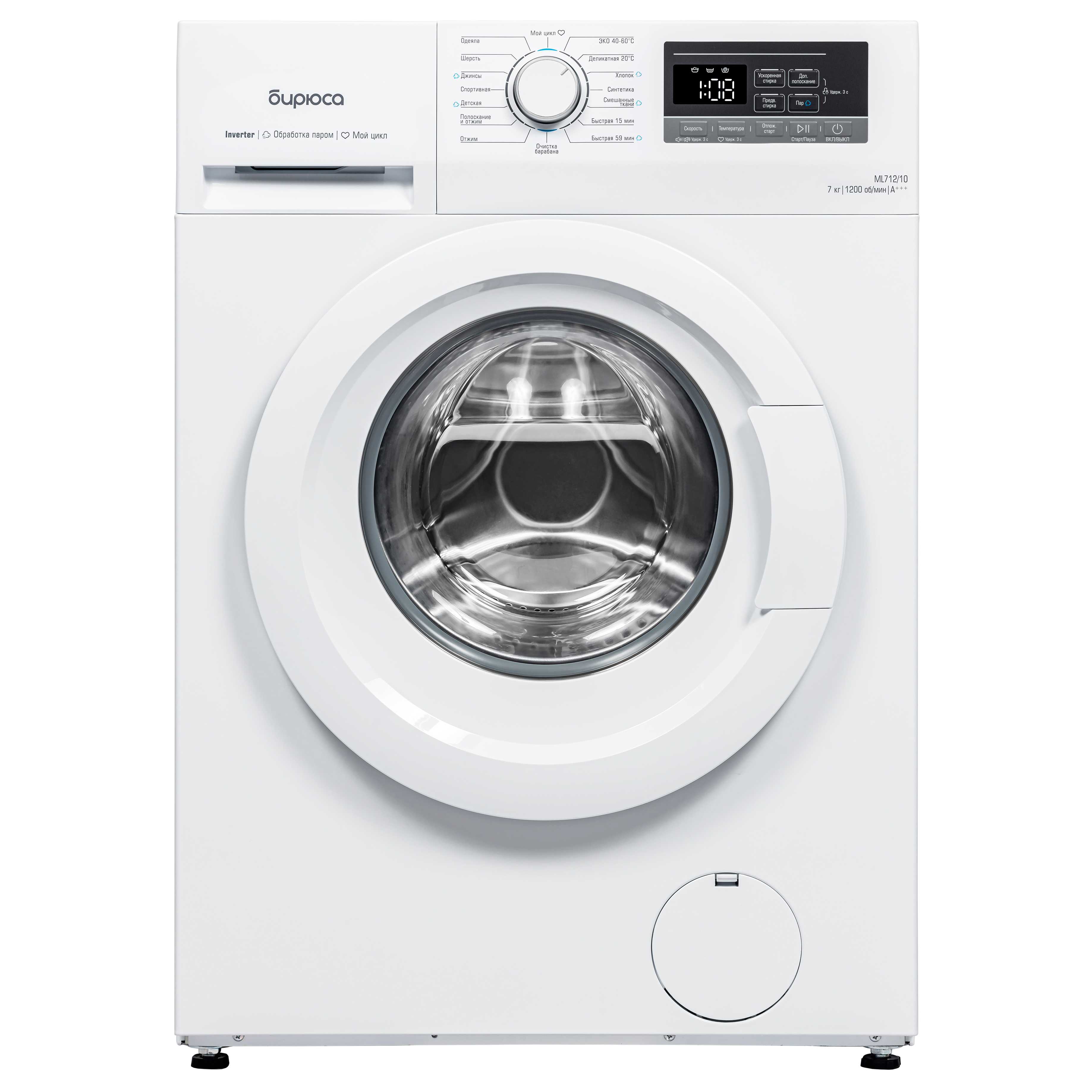 Дополнительные функции Выбор скорости отжима, Выбор температуры, Обработка паром, Предварительная стирка, Дополнительное полоскание, Блокировка от детей, Ускоренная стирка, Отложенный старт, Отключение звукового сигнала