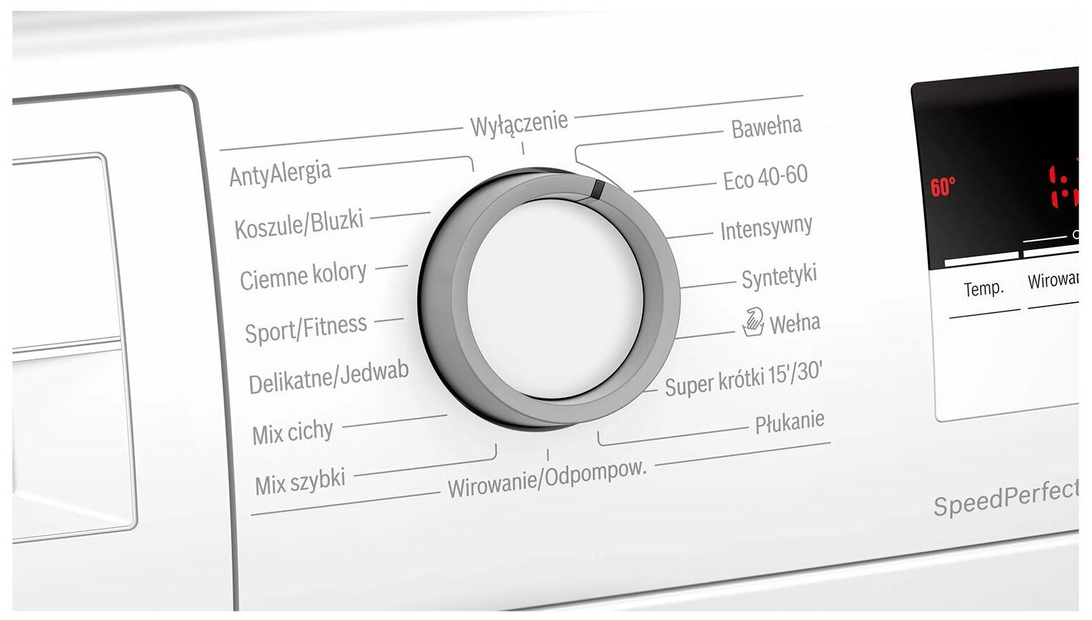 Кнопки TouchControl: Приготовление, Старт/Пауза с дозагрузкой, Температура, SpeedPerfect, Предварительная стирка, Изменение скорости отжима/Пауза отжима