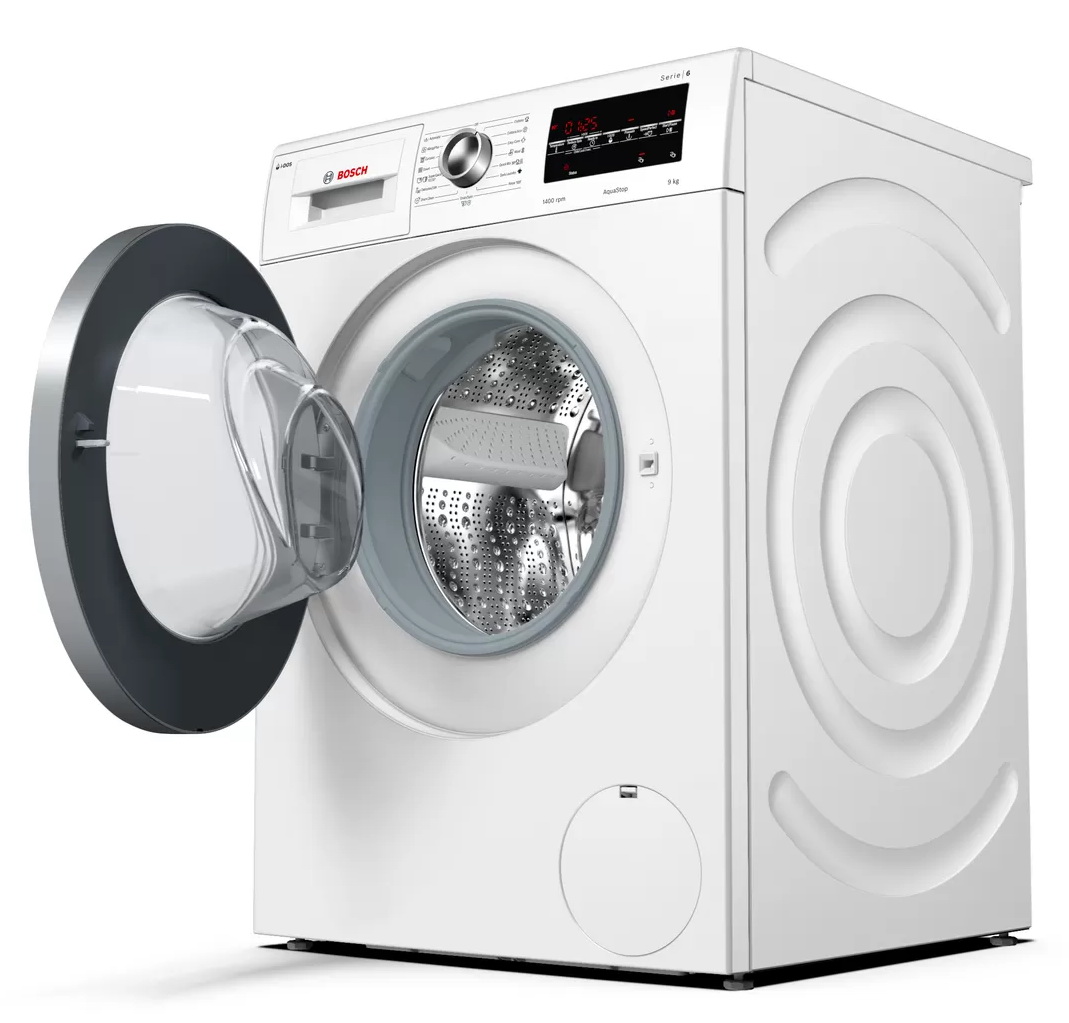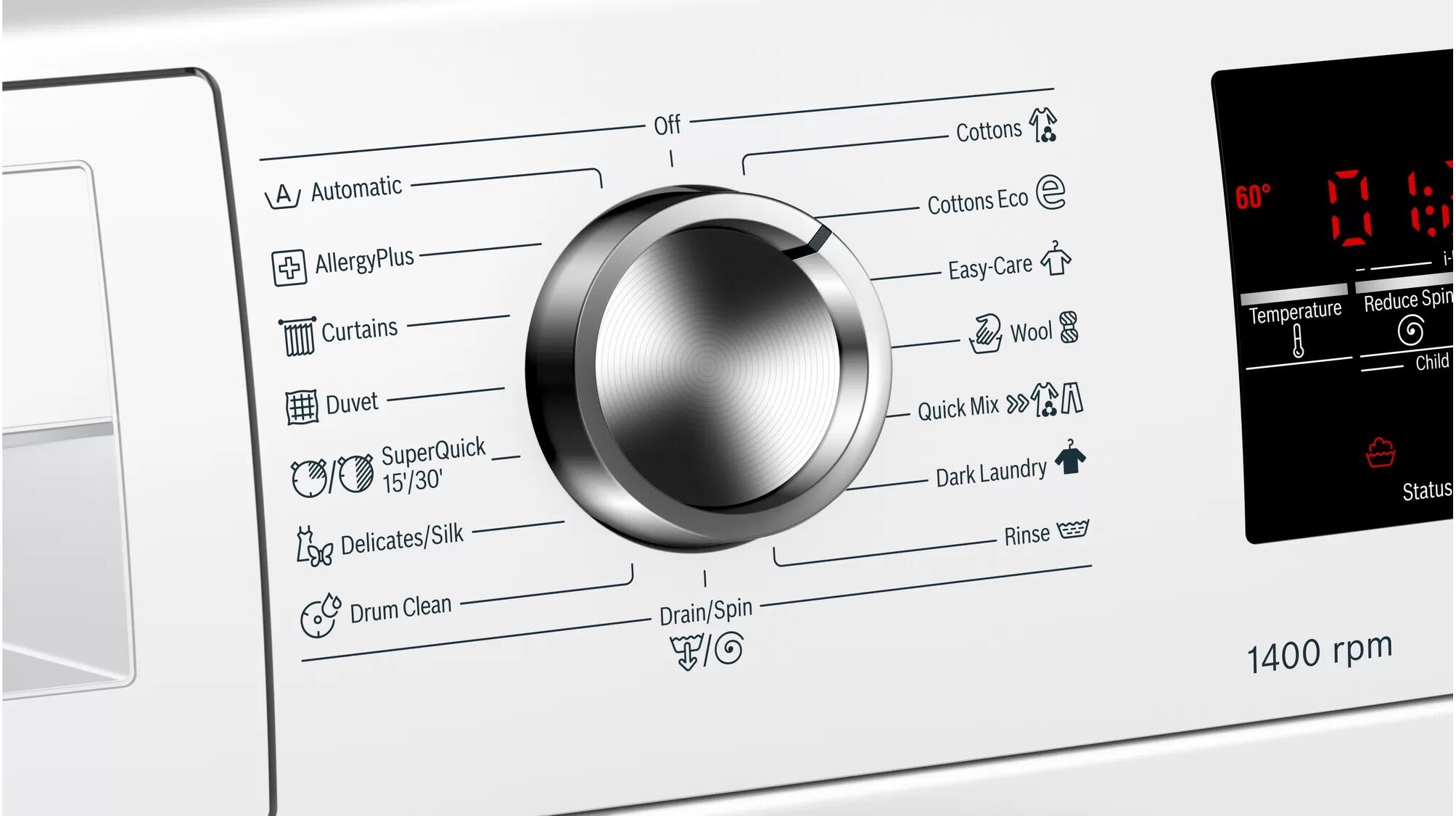 Большой светодиодный дисплей для индикации состояния программы, выбор температуры, макс. скорость отжима, оставшееся время и 24 ч время задержки конец, рекомендация нагрузки и индикация потребления энергии