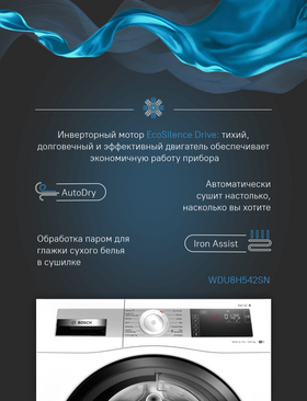 Доп. функции Сушка по времени, Освежение паром Refresher, Стирка&Сушка, Автосушка, Регулируемая температура сушки