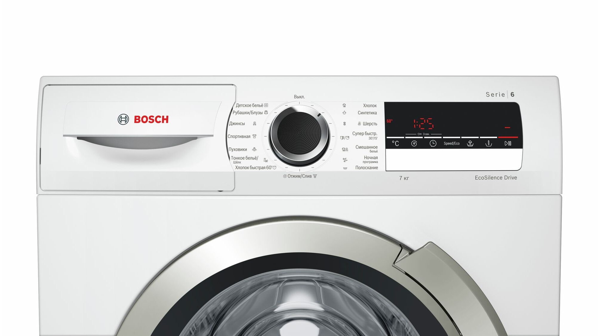 Большой многофункциональный дисплей: время до окончания, индикация хода программы, выбор температуры, выбор скорости отжима, таймер (время до окончания 24 ч)