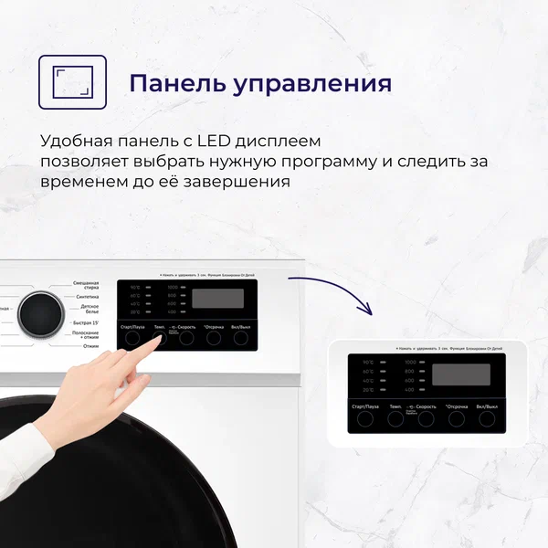 Программы стирки: Быстрая стирка, Полоскание + отжим, Отжим, Стирка детской одежды, Стирка изделий из синтетики, Стирка изделий из шерсти, Стирка нижнего белья, Стирка одеял