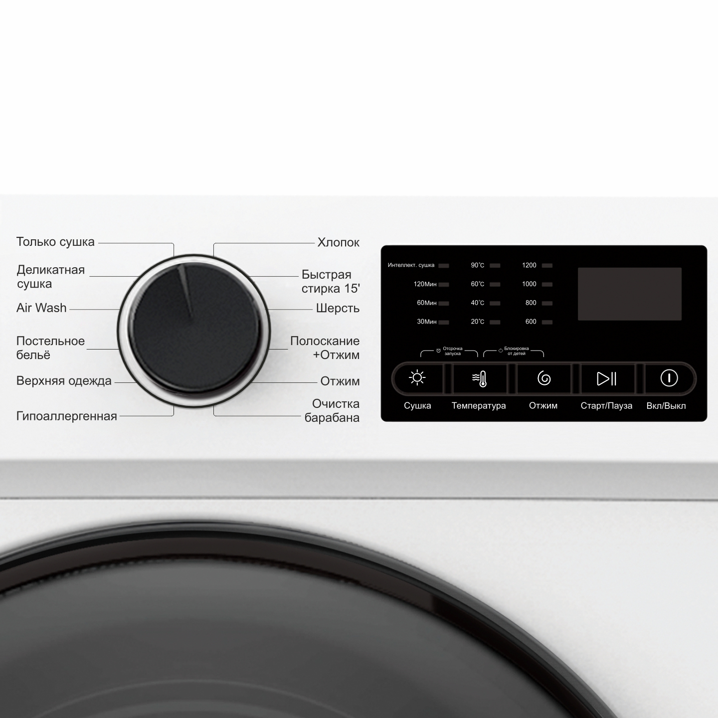 Выбор времени сушки до 120мин., Интеллектуальная сушка, Отсрочка старта, Блокировка от детей