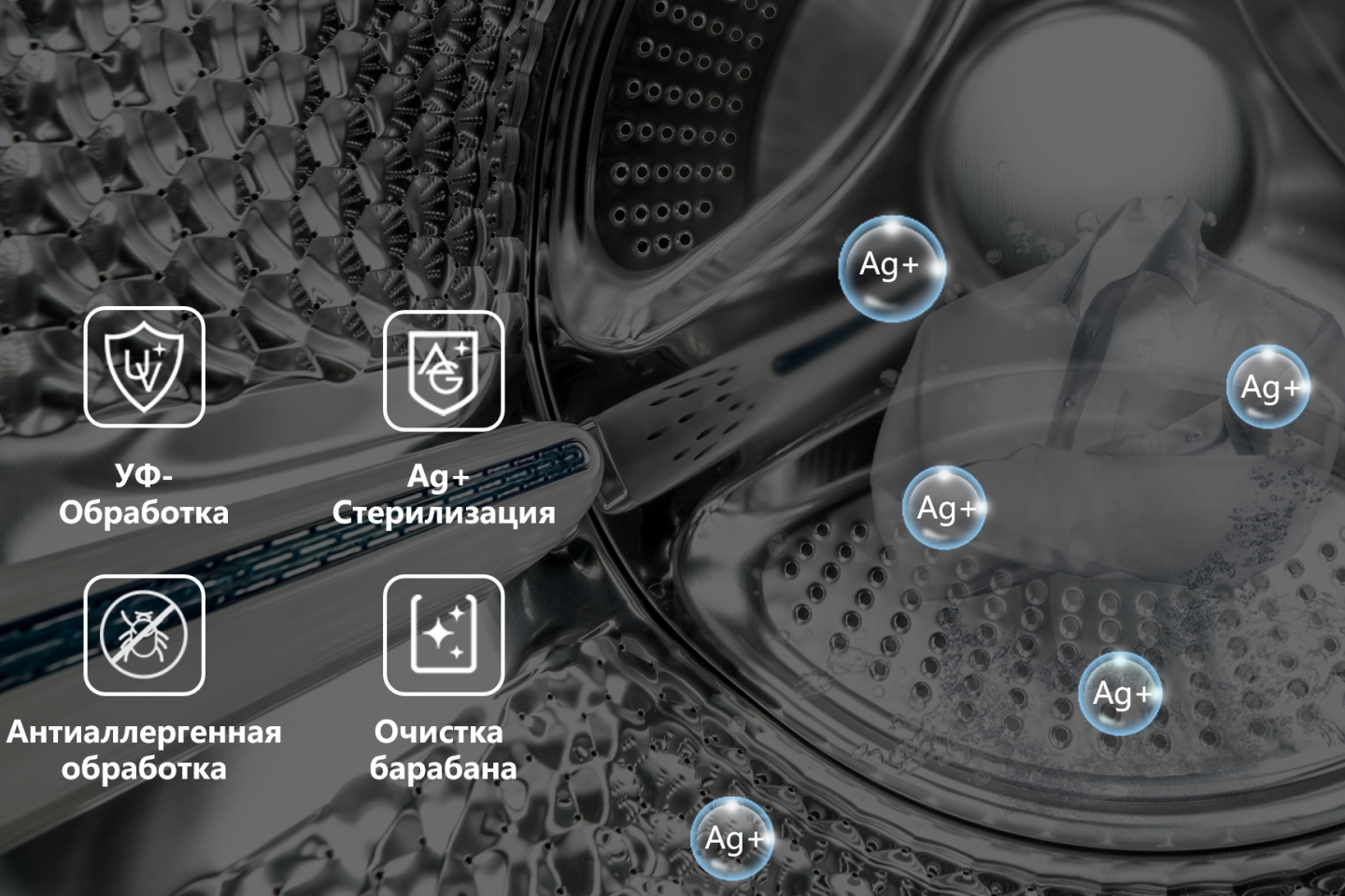 УФ и AG+ стерилизация, отложенный старт, подсветка баков, технология i-Dos - автоматическое дозирование моющих средств, стирка паром и пр.