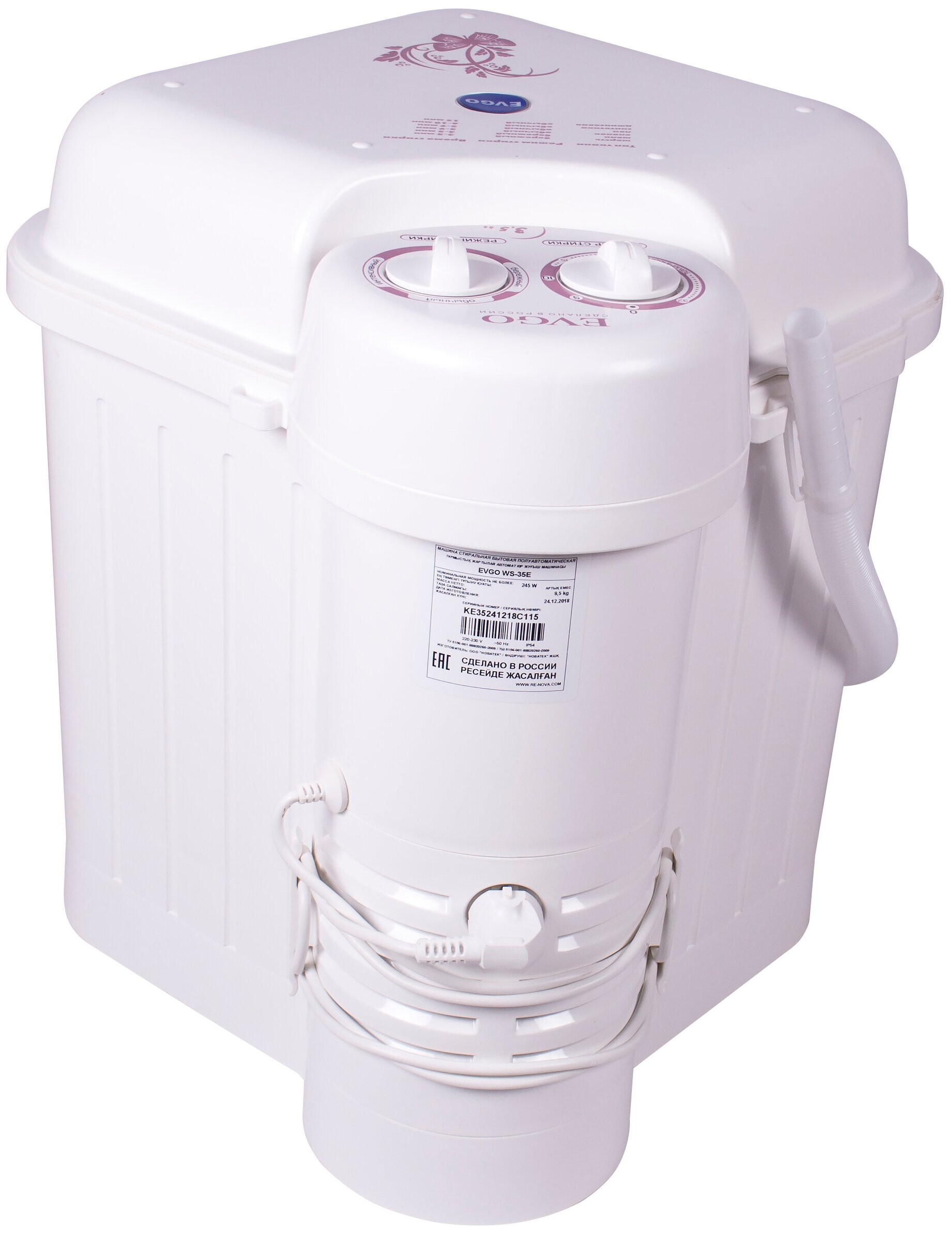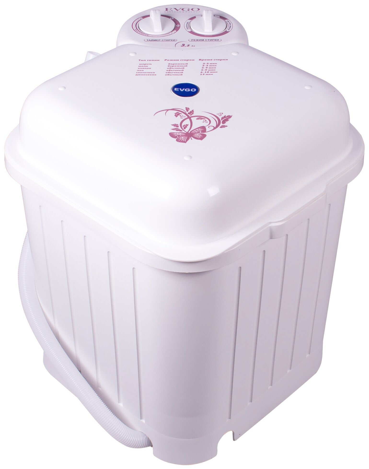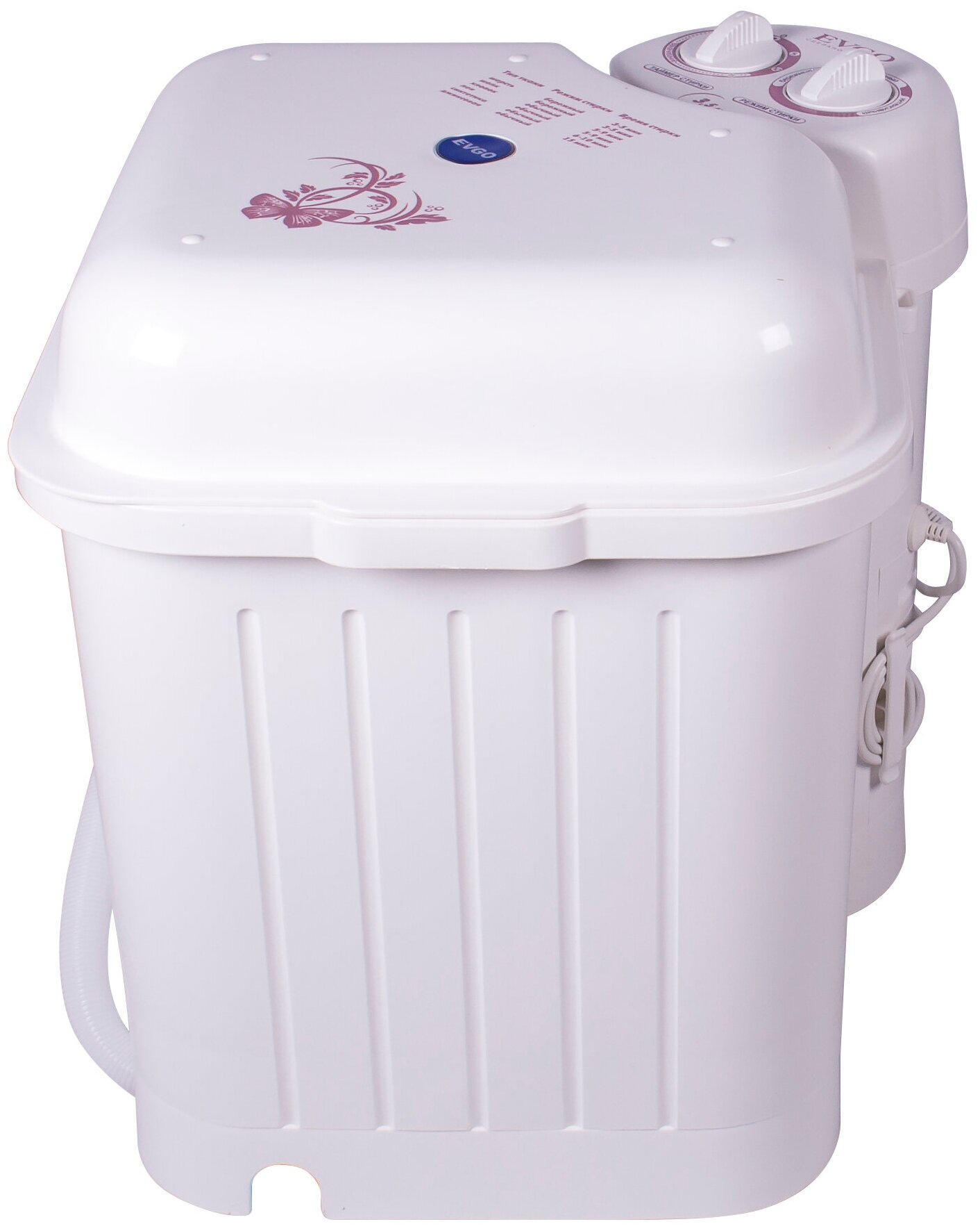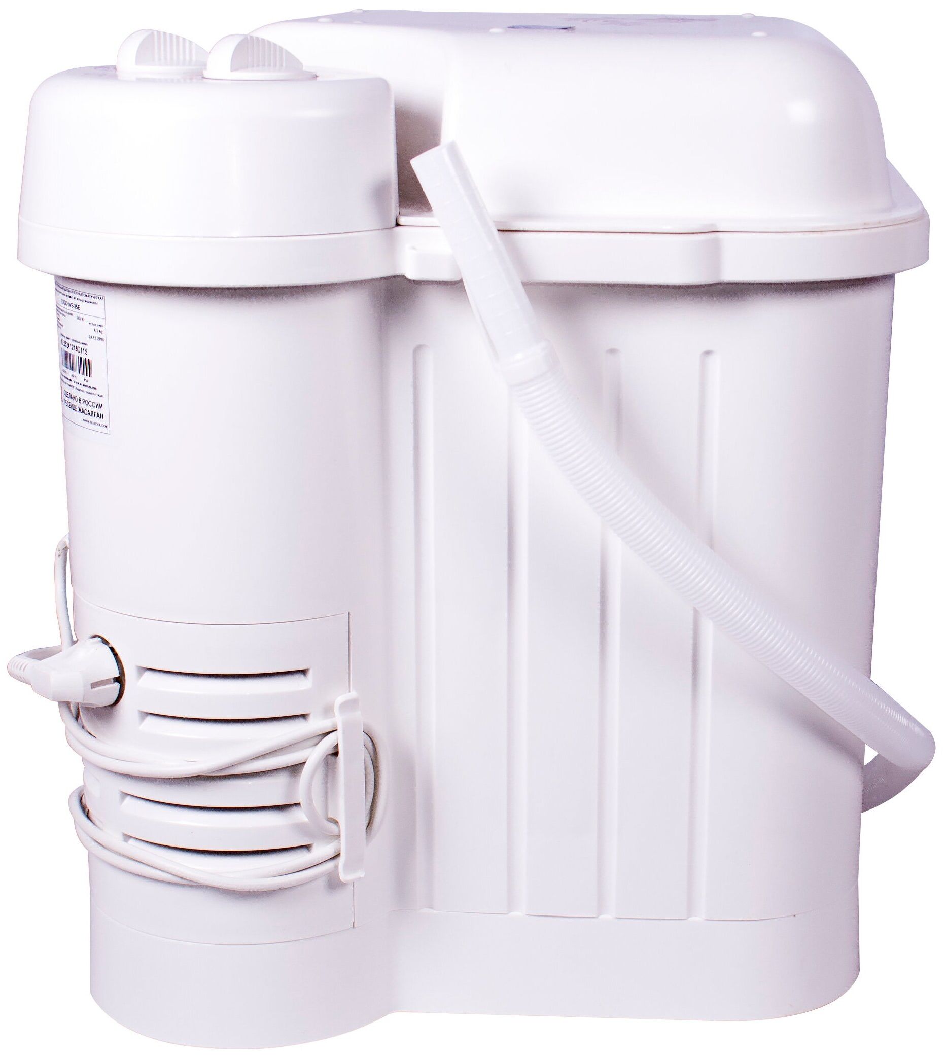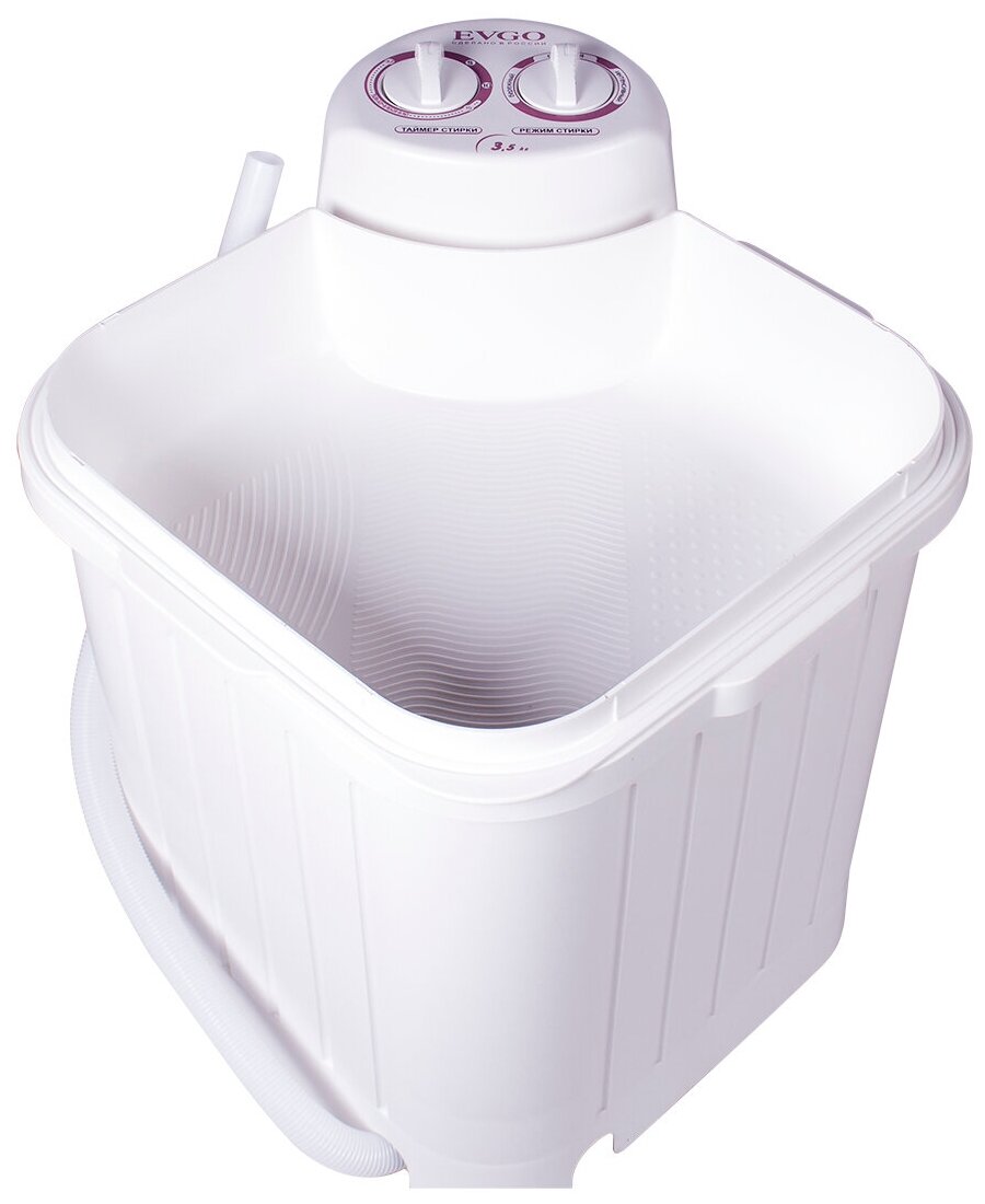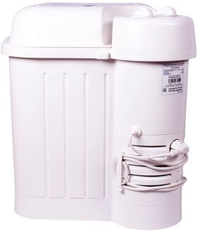таймер стирки до 15мин, крышка-тазик емкостью 9л, реверс, фильтр для сбора ворса и пуха, отжим отсутствует; максимальная потребляемая мощность (Вт) 245