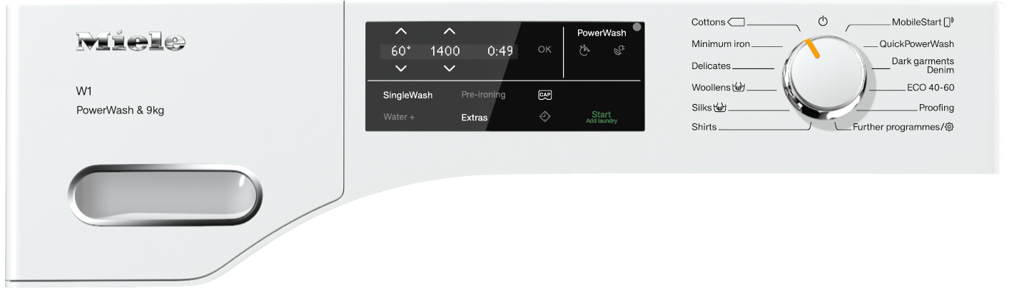 Программы Автоматическая +, QuickPower, Хлопок, Деликатная, Сорочки, Шелк, Шерсть, Пропитывание, Спортивное белье, ECO 40–60, Экспресс 20, Темные вещи, Джинсы, Разглаживание паром, Только полоскание, Слив/Отжим, Накрахмаливание