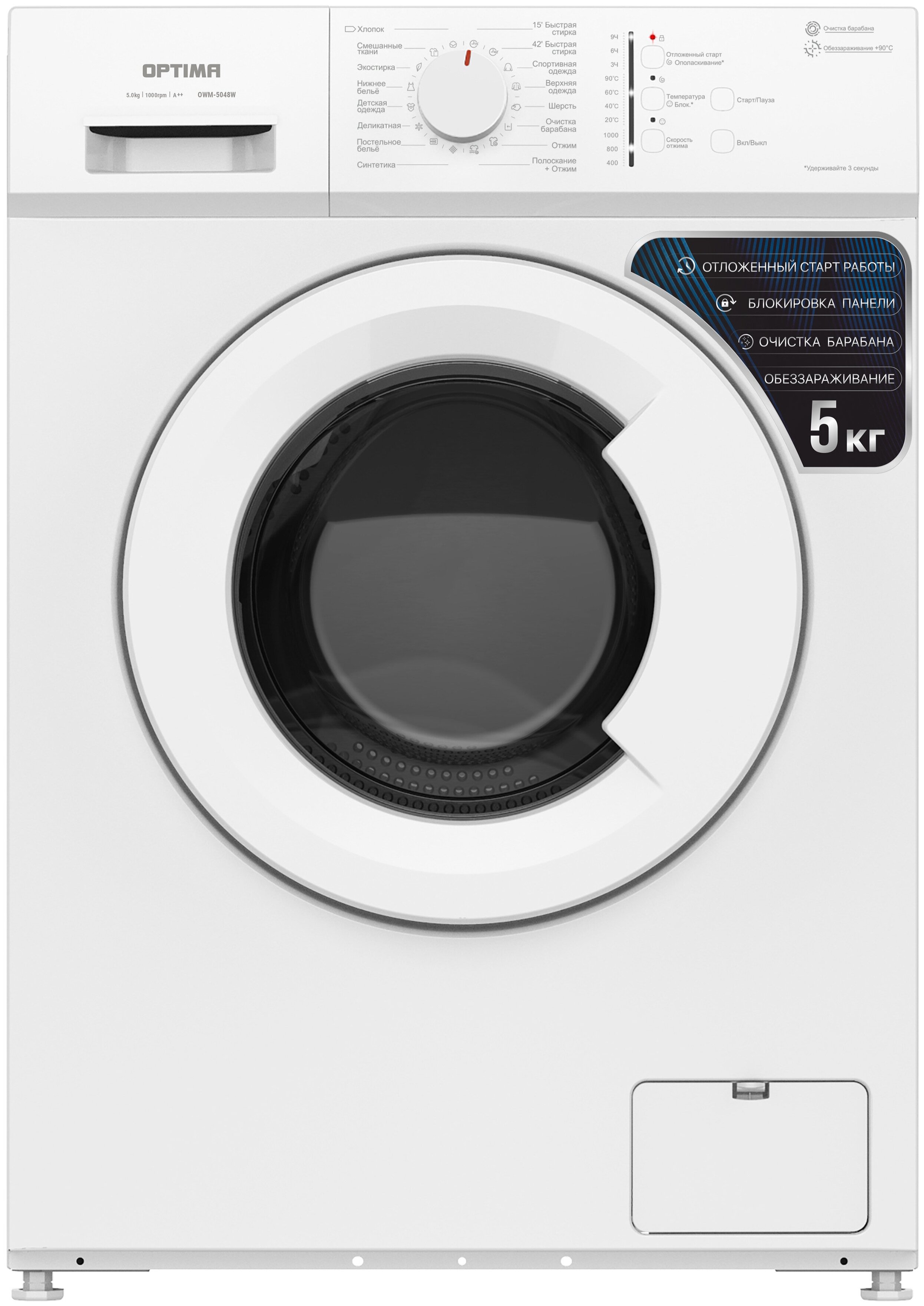 выбор скорости отжима, выбор температуры стирки, отложенный старт, очистка барабана