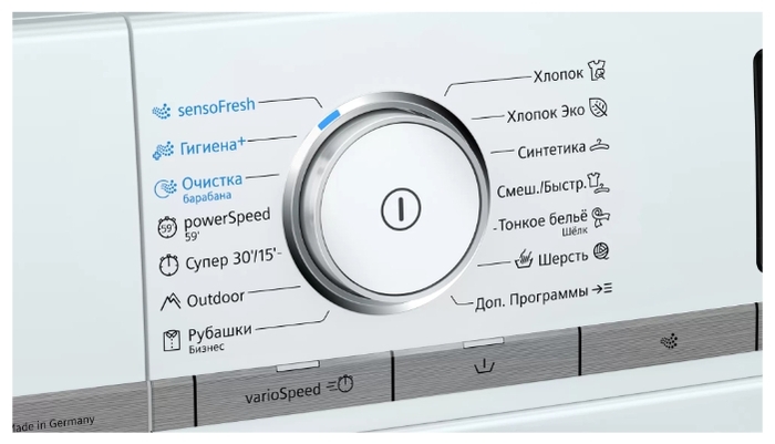 Программы sensoFresh, гигиена +, очистка барабана, powerSpeed, супер 30/15, Outdoor, рубашки (бизнес), хлопок, хлопок Эко, синтетика, смешанное/быстро, тонкое бельё/шёлк, шерсть, доп. программы