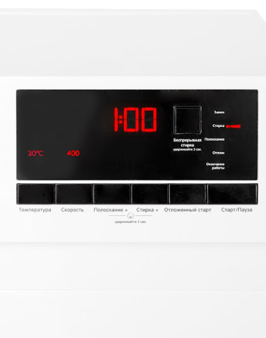 включения, времени до конца цикла, окончания стирки, отсрочки старта, паузы, рабочего цикла, скорости отжима, температуры