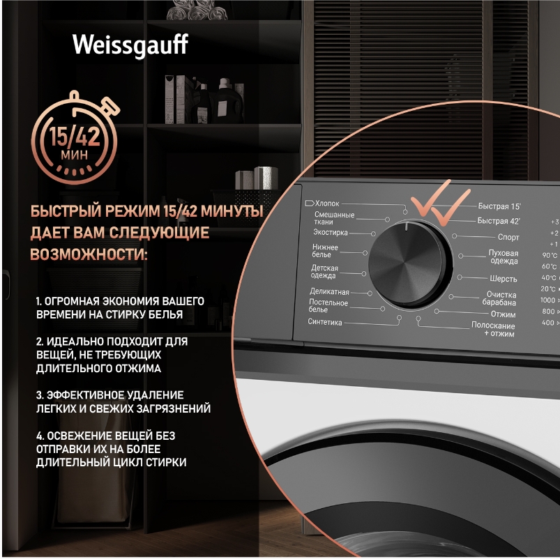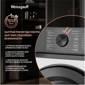 Быстрая стирка 42' минуты- подходит для разных типов тканей со средним уровнем загрязнения и обеспечивают максимальную чистоту и эффективность стирки за короткое время.