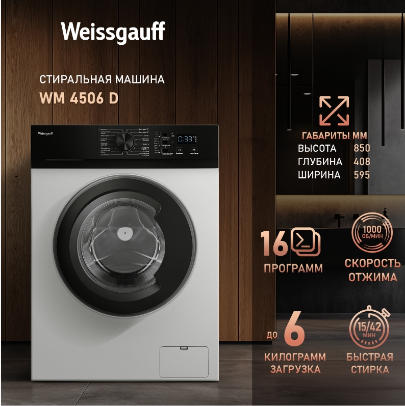 Отдельностоящая стиральная машина Weissgauff, имеющая невероятно компактную глубину 40.8 см, а также достойные показатели загрузки до 6 кг белья и скорость отжима до 1000 оборотов в минуту - это воплощение основного принципа Weissgauff: "Качество, доступное каждому"!