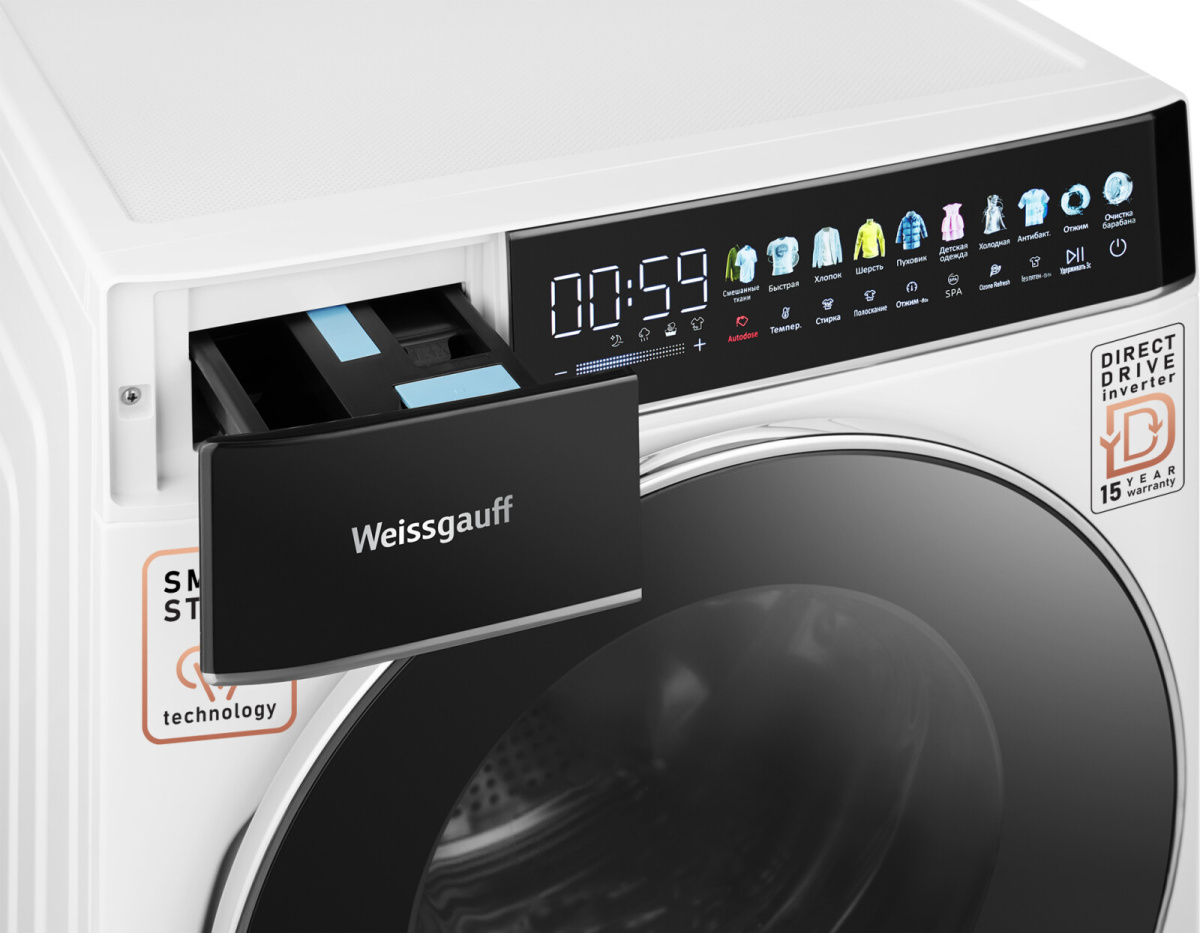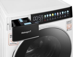 Отдельностоящая стиральная машина Weissgauff, оснащенная прямым приводом, инверторным двигателем и функцией пара, имеющая показатели загрузки до 11 кг белья и скорости отжима до 1400 оборотов в минуту, а также цветной дисплей SMART SCREEN, функции автодозирования и озонирования - это одна из наиболее передовых моделей Weissgauff в категории стиральных машин!