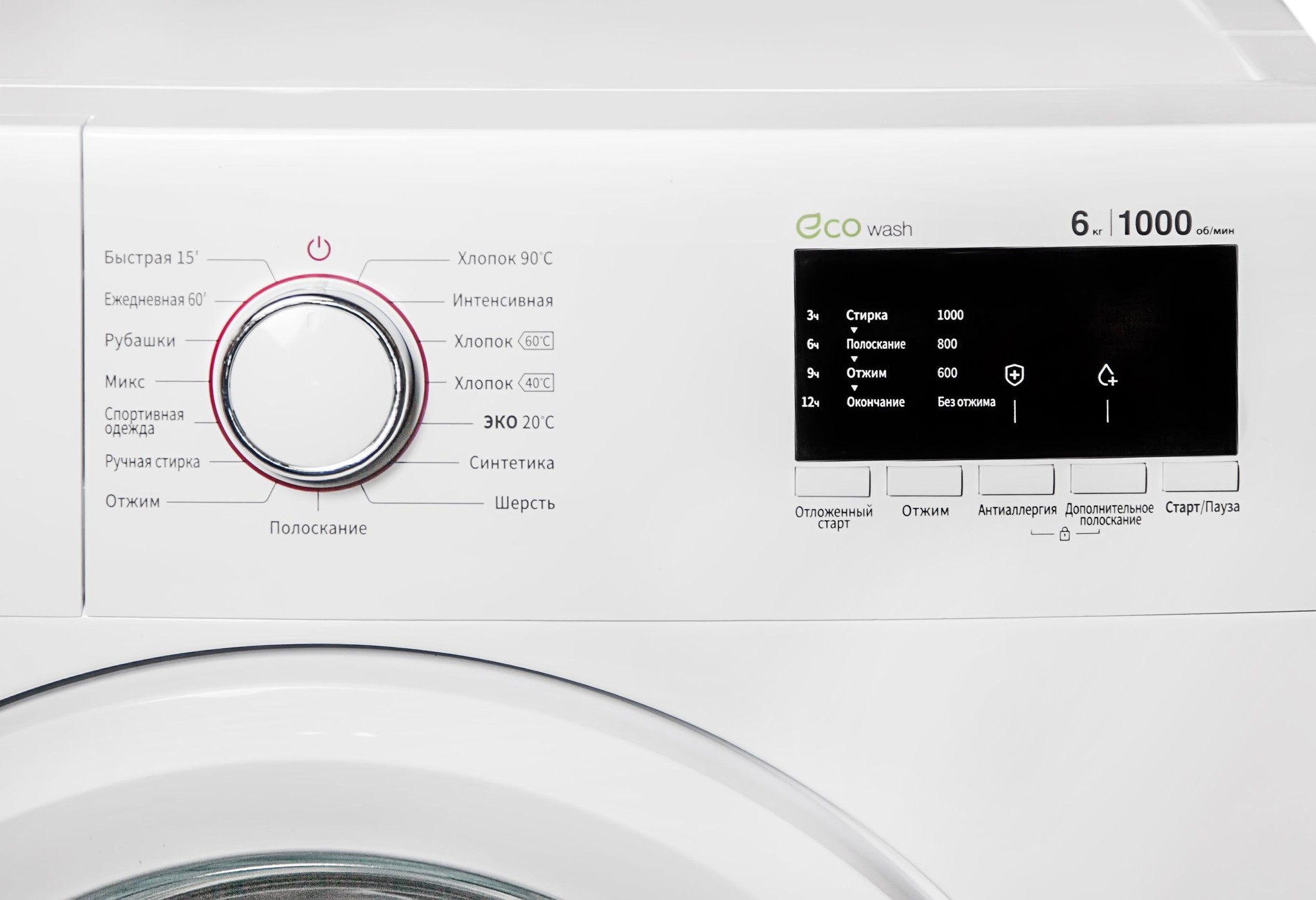 Программы: Быстрая 15 мин., Ежедневная 60 мин., Рубашки, Микс, Спортивная одежда, Ручная стирка, Отжим, Хлопок 90C, Интенсивная, Хлопок 60C, Хлопок 40C, Эко 20C, Синтетика, Шерсть, Полоскание