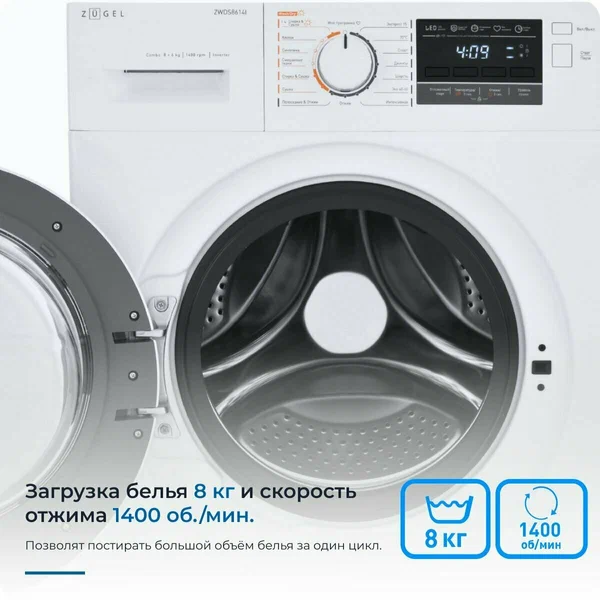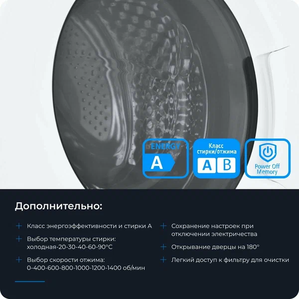 Программы стирки: Экономичная стирка, Сушка, Стирка спортивной одежды, Стирка смешанных тканей, Быстрая стирка, Дополнительное полоскание, Настраиваемый режим стирки, Отжим, Полоскание + отжим, Предварительная стирка, Стирка изделий из синтетики, Стирка изделий из хлопка, Стирка деликатных тканей, Стирка изделий из джинсовой ткани, Интенсивная стирка