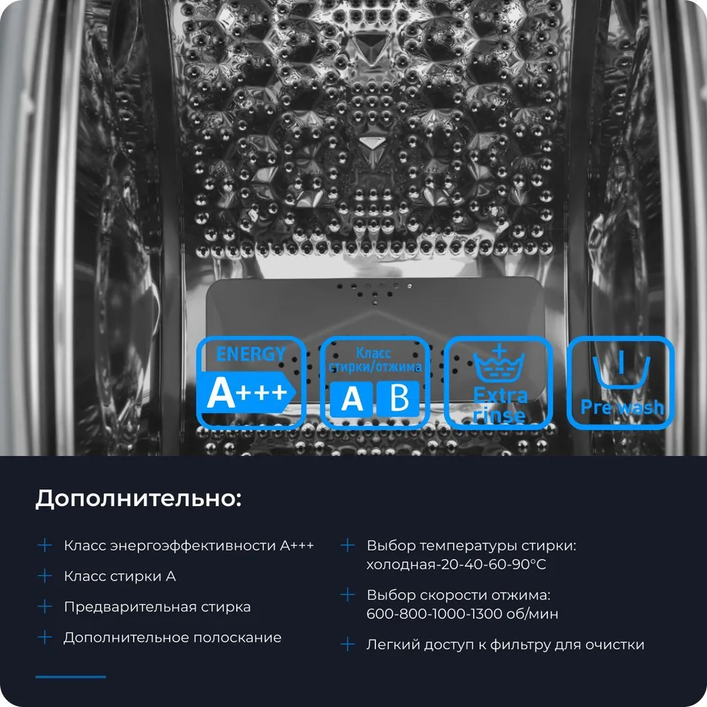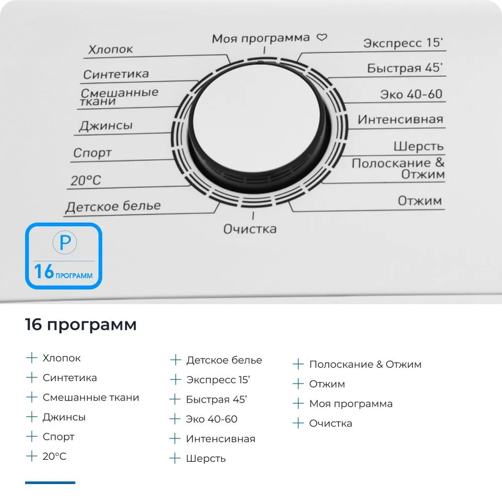 Программы стирки: Быстрая стирка, Отжим, Полоскание + отжим, Стирка детской одежды, Стирка изделий из джинсовой ткани, Стирка изделий из синтетики, Стирка изделий из шерсти, Стирка изделий из хлопка, Стирка смешанных тканей, Стирка спортивной одежды, Экономичная стирка, Цветное белье, Ежедневная стирка