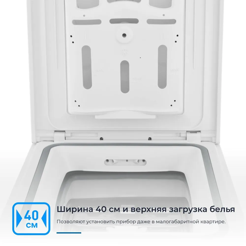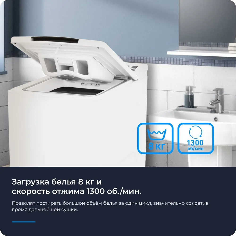 Ее ширина всего 40 см, и она имеет вертикальную загрузку белья, что позволяет устанавливать прибор даже в малогабаритной квартире. Загрузка белья 8 кг и скорость отжима 1300 об./мин позволят постирать большой объём белья за один цикл, значительно сокращая время дальнейшей сушки. Также машина имеет 16 программ стирки, что позволяет выбрать оптимальный режим для различных типов тканей.