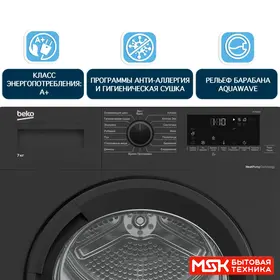 Сушильная машина Beko DF7412GB с максимальной загрузкой барабана 7 кг и 15 программами. Сушильная машина оснащена функциями разглаживания и охлаждения белья, а также блокировкой кнопок от случайного нажатия и функцией отложенного старта до 24 часов. Модель оснащена тепловым насосом Heat-Pump, который обеспечивает высокий результат сушки при низкой температуре и минимальном энергопотреблении.