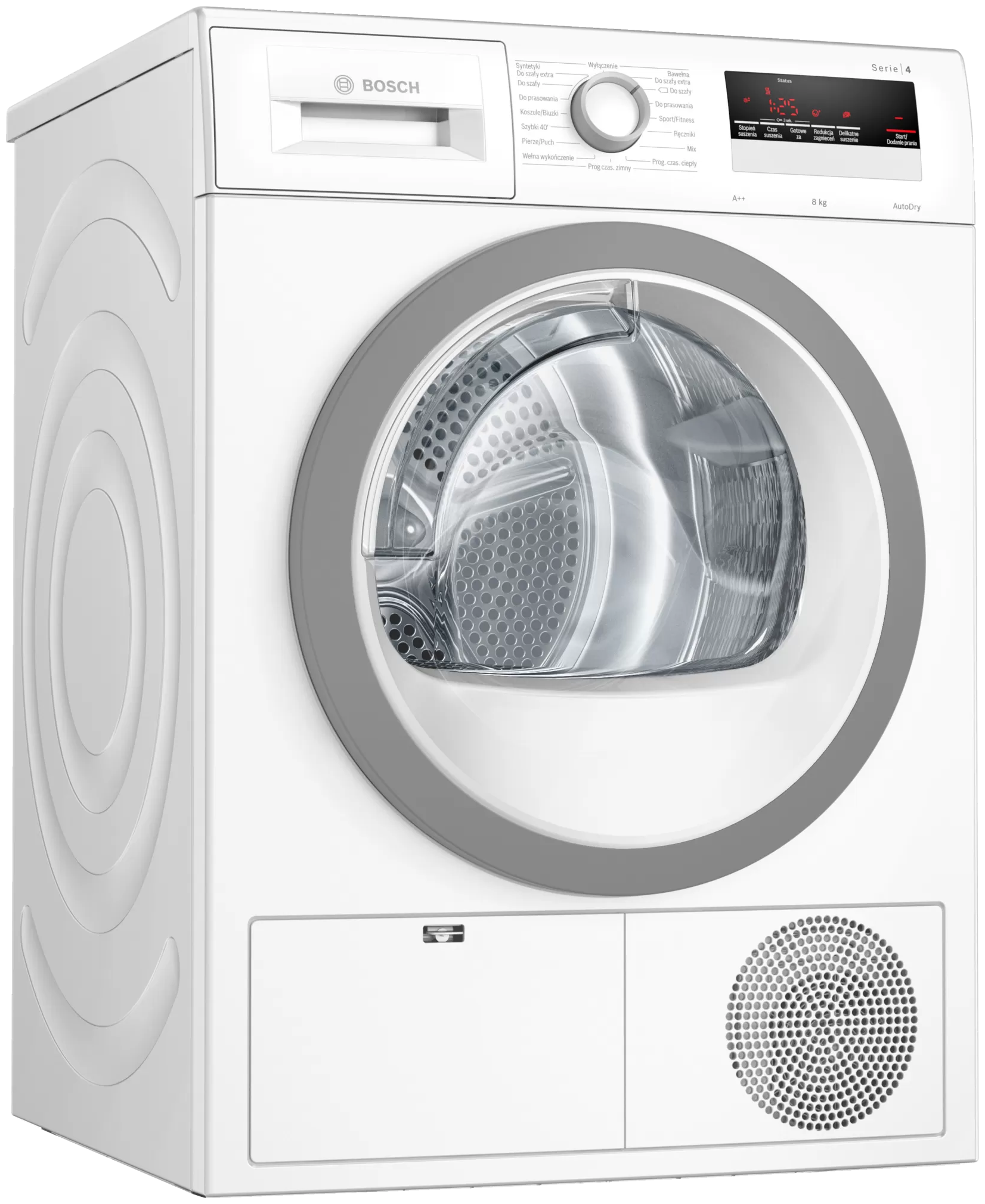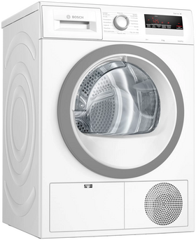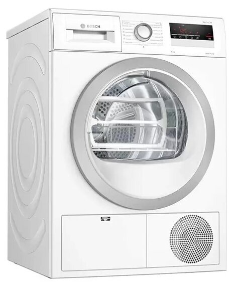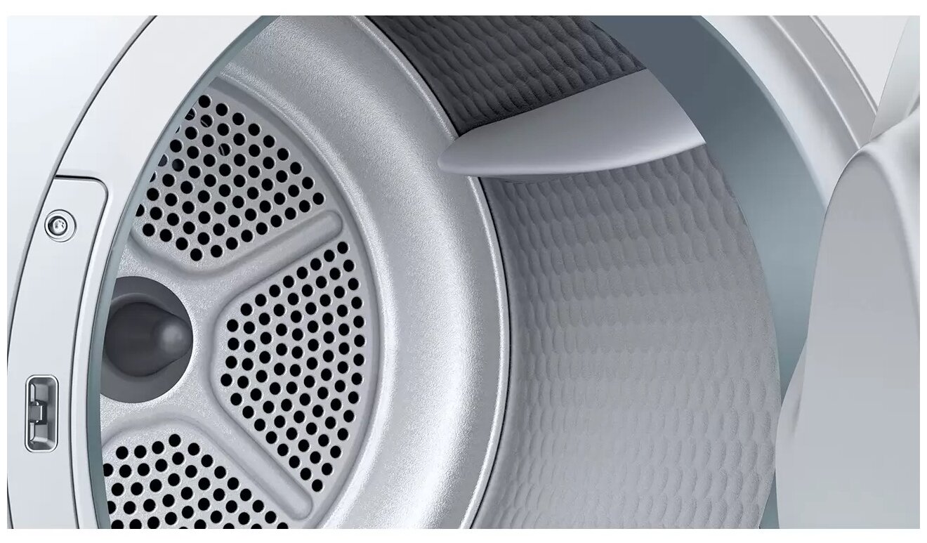 Сушильная машина оснащена люком диаметром 34 см, расположенном на фронтальной части корпуса. Максимально допустимая загрузка не должна превышать 8 кг. Возможна отсрочка времени запуска устройства на срок до 24 ч. Доступно 15 рабочих программ для деликатной сушки разных типов тканей.