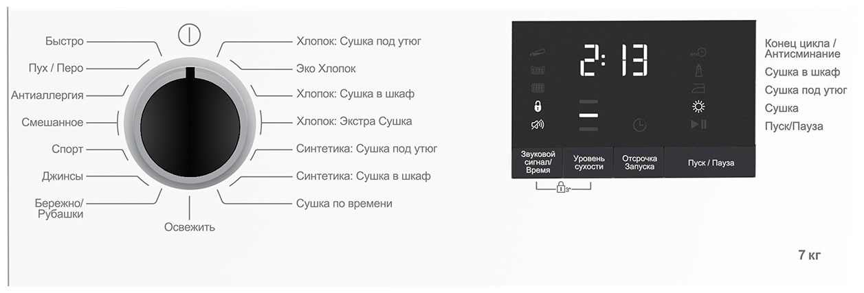 Количество программ: 15, среди которых Быстро, Пух/Перо, Антиаллергия, Смешанное, Спорт, Джинсы, Бережно/Рубашки, Освежить, Хлопок:Сушка под утюг, Эко Хлопок, Хлопок: Сушка в шкаф, Хлопок: Экстра Сушка, Синтетика: Сушка под утюг, Синтетика: Сушка в шкаф, Сушка по времени