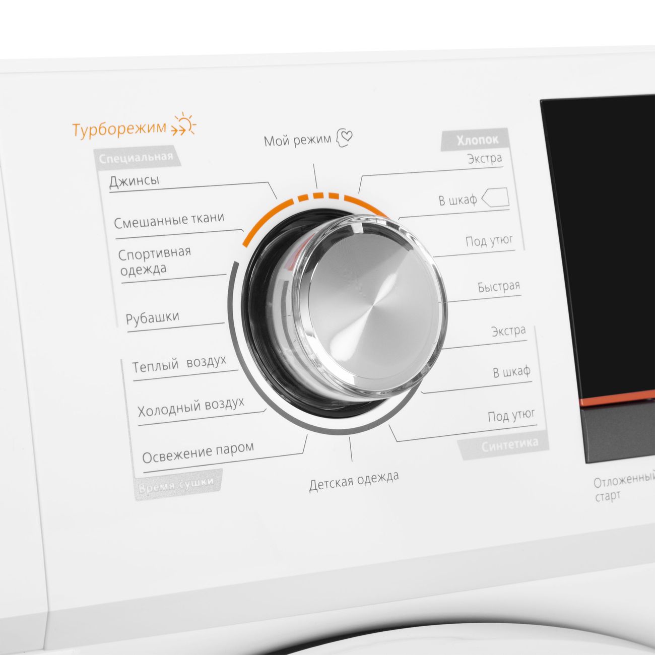 Режим турбо - поможет вам сократить продолжительность выбранной программы без потери качества стирки, за счет того, что машина понемногу сокращает время каждого из циклов, не исключая их полностью. Таким образом, вы получаете высокий результат за короткое время.«Мой режим» позволит вам создать свою программу стирки с индивидуальными настройками: температурой, скоростью оборотов при отжиме и дополнительными функциями. Ваша уникальная программа будет сохранена и отобразится в верхнем положении регулятора, вы сможете в любой момент включить ее.