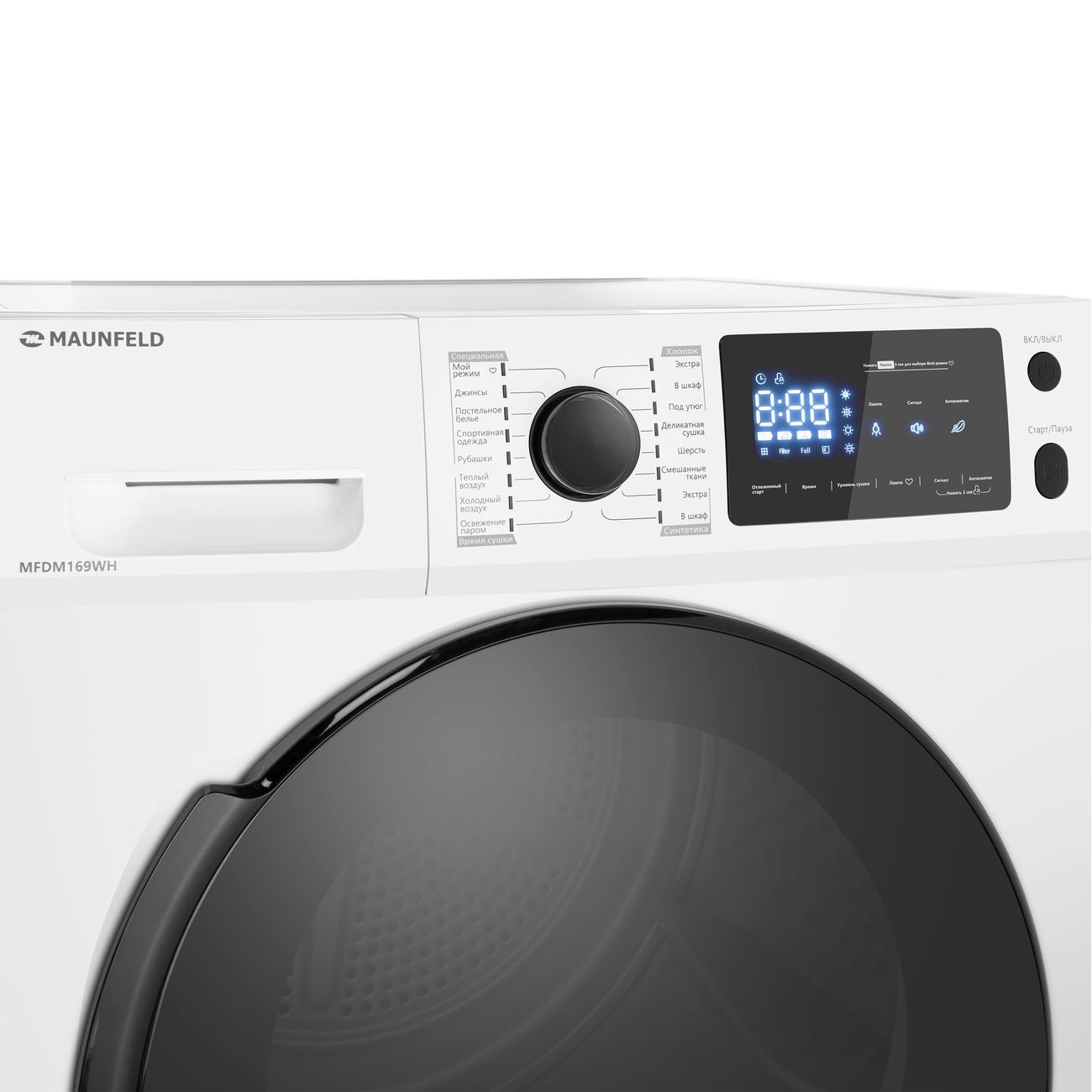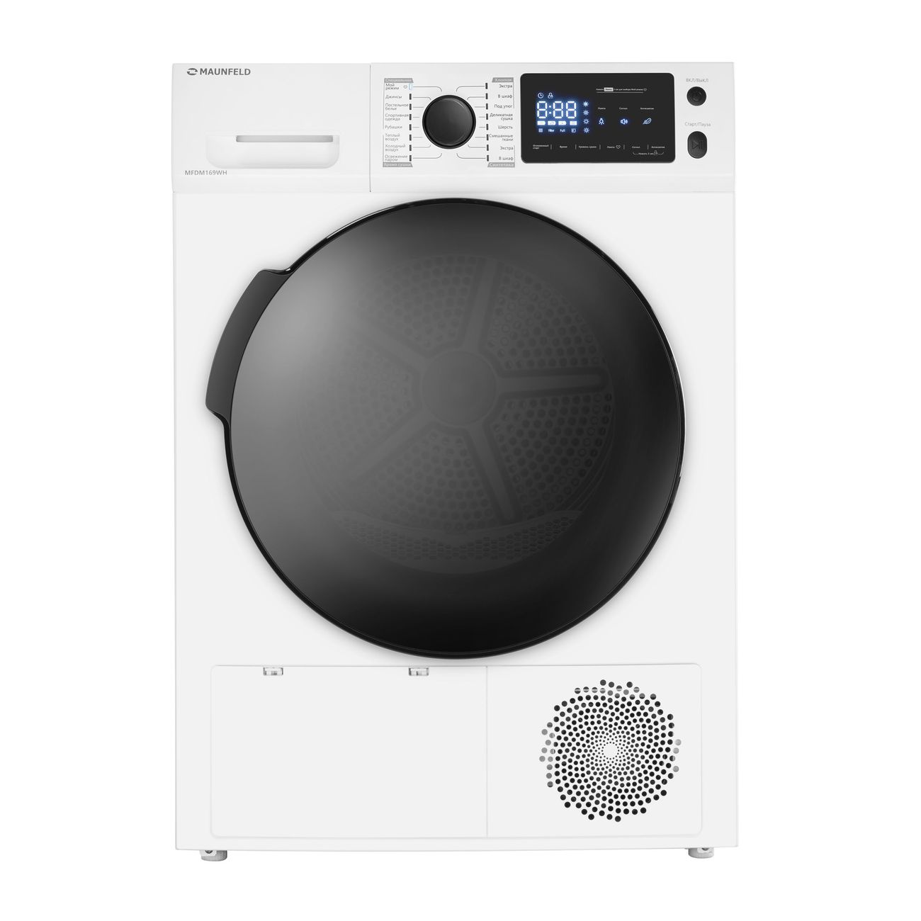 Угол открытия дверцы 180 градусов при диаметре люка 375 мм делает процесс загрузки и извлечения одежды из сушильной машины простым и удобным.