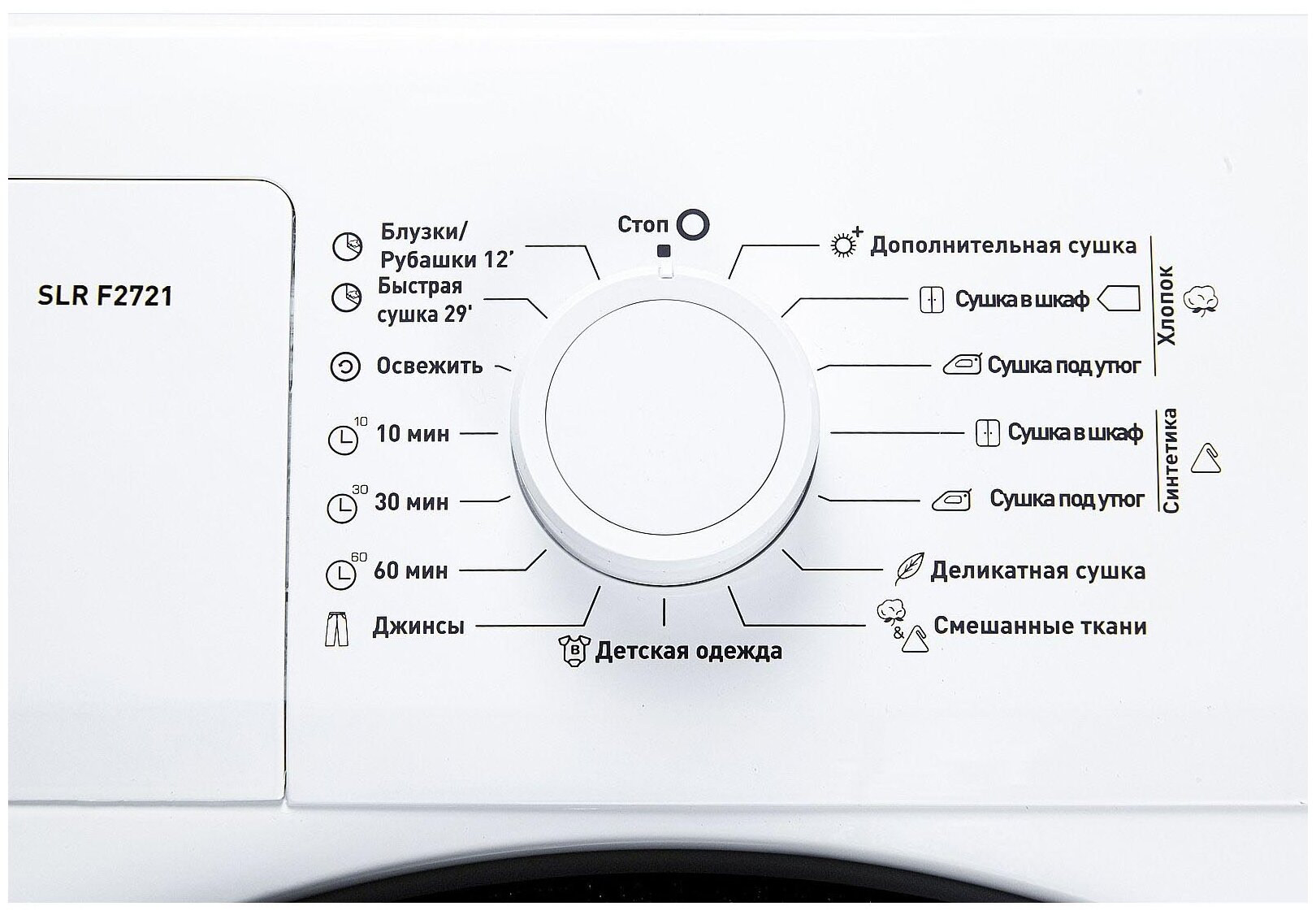 Эта программа позволяет сушить синтетические изделия, такие как майки, футболки, блузки при температуре ниже, чем температура в программе сушки хлопковых тканей, чтобы их можно было положить в шкаф.