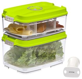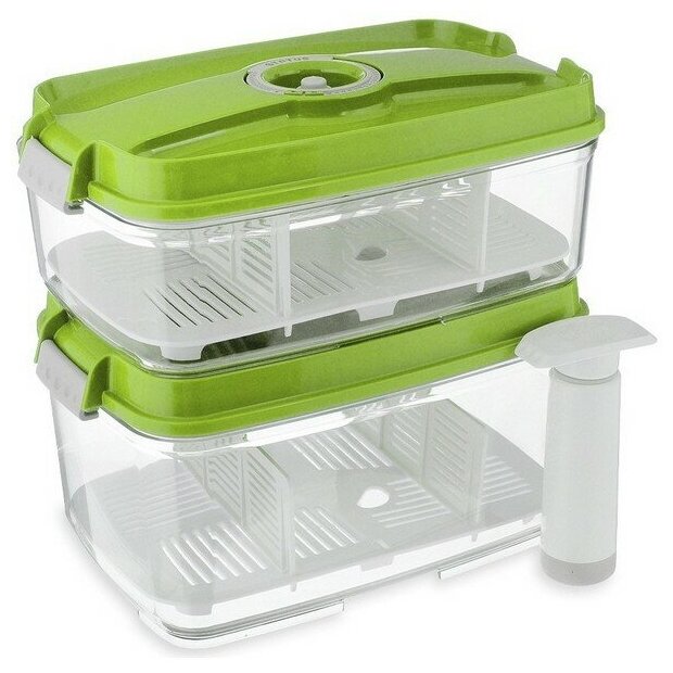 Набор Status VAC-REC-Bigger состоит из двух вакуумных контейнеров разного размера, вкладышей-разделителей, а также ручного насоса для откачивания воздуха. Он значительно продлевает срок хранения продуктов. Кроме того, в нем можно мариновать полуфабрикаты и готовить оригинальные блюда в собственном соку.