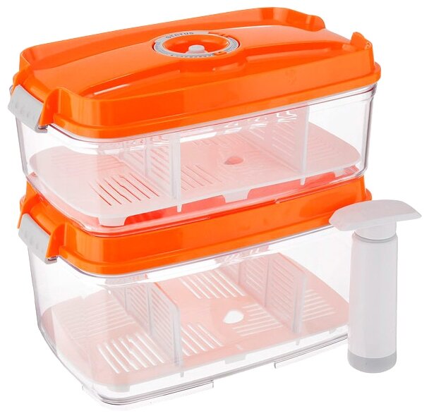 Набор Status VAC-REC-Bigger состоит из двух вакуумных контейнеров разного размера, вкладышей-разделителей, а также ручного насоса для откачивания воздуха. Он значительно продлевает срок хранения продуктов. Кроме того, в нем можно мариновать полуфабрикаты и готовить оригинальные блюда в собственном соку.