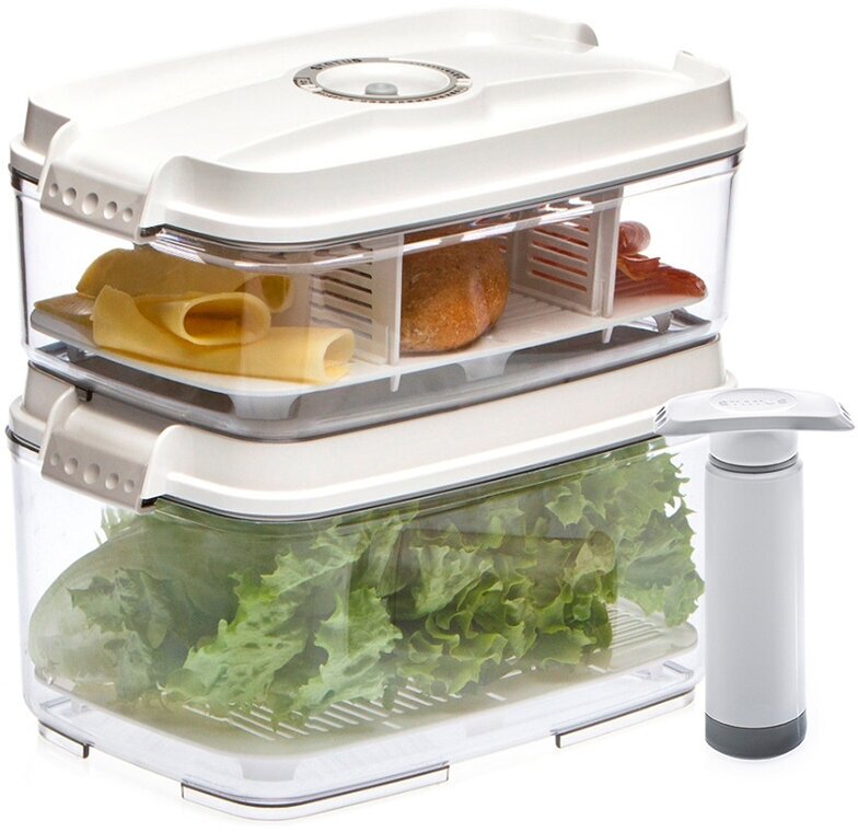 Благодаря использованию вакуумных контейнеров, продукты не подвергаются внешнему воздействию и срок хранения значительно увеличивается. Продукты сохраняют свои вкусовые качества и аромат, а запахи в холодильнике не перемешиваются.